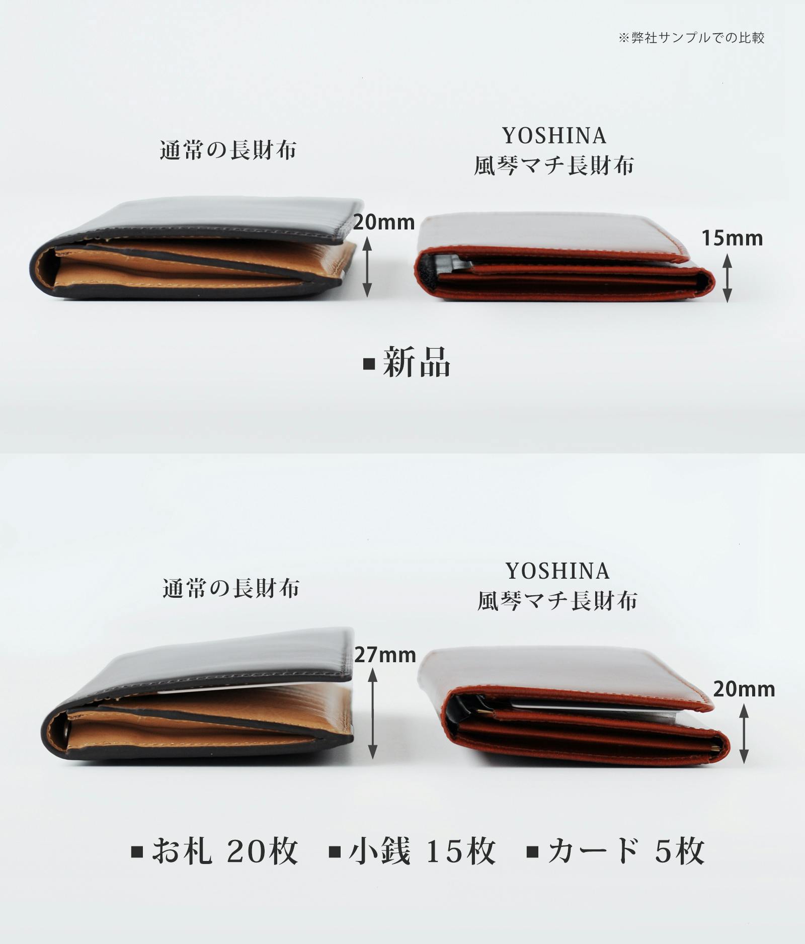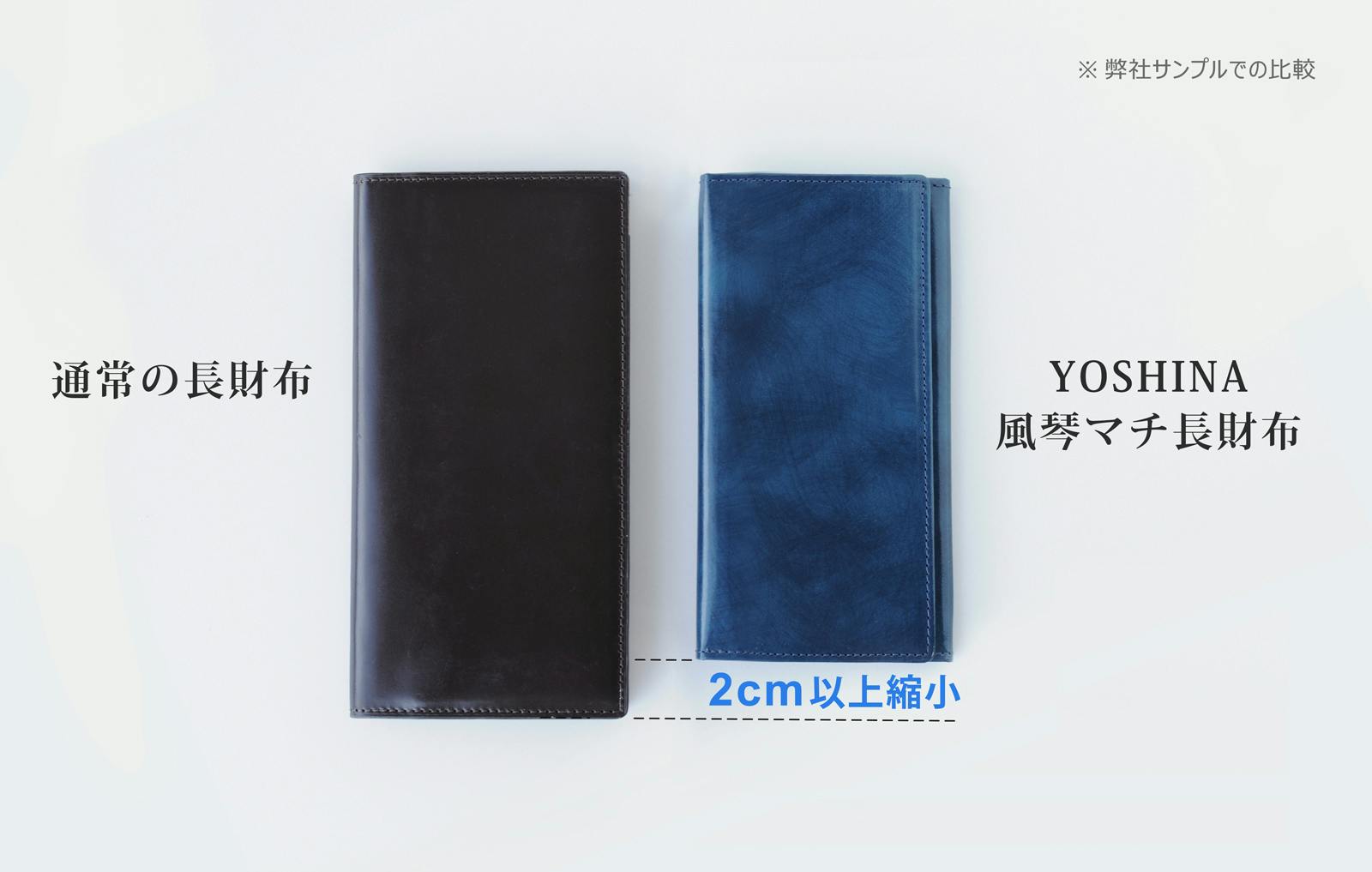 YOSHINA風琴マチ長財布は熟練職人の精密な型紙設計及び数多くの量産経験で積み重ねた組み立て技術により「コンパクトさ」を保ちながら、「使い心地」を損なわない一品に仕上げました。