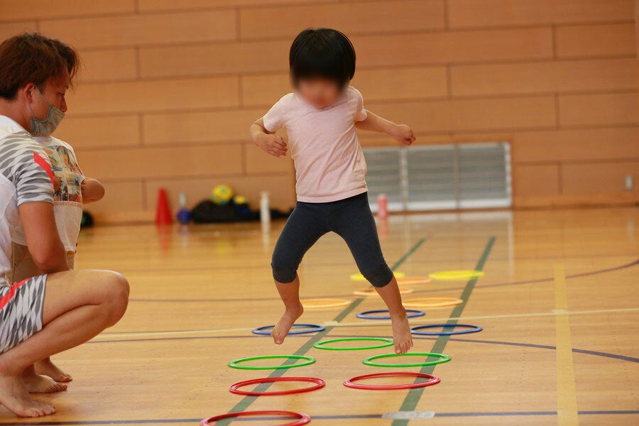 目標や挑戦(輪に足が入るようにジャンプ)と、その結果(足が輪に入ることができた OR できなかった→成功・失敗体験)が矢継ぎ早に体験でき、ルールもあるので考えながら楽しく飽きずに、自然と体を動かすことができます。