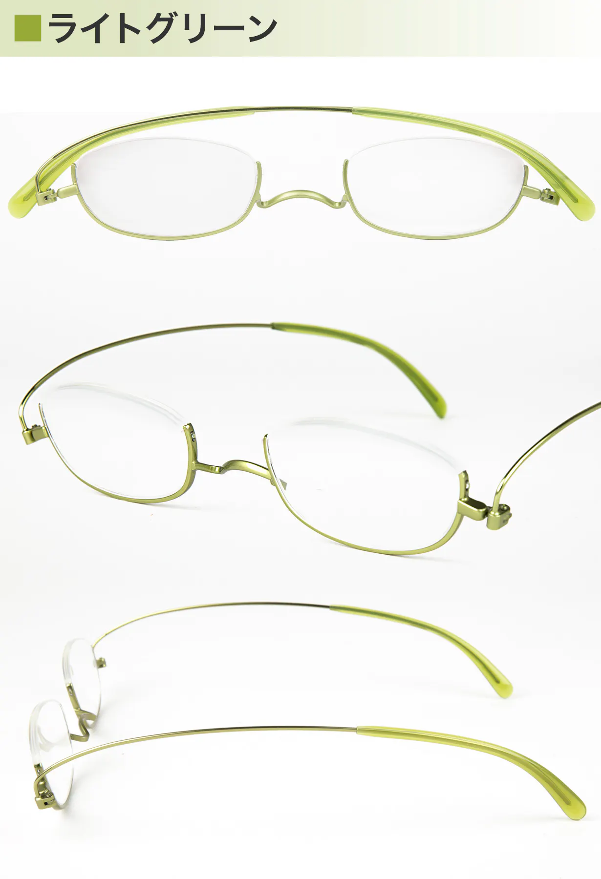 レンズ上部にフレームがないためリムの主張が少ないという特質を活かし、掛けた時に発色が良く見えるカラー。