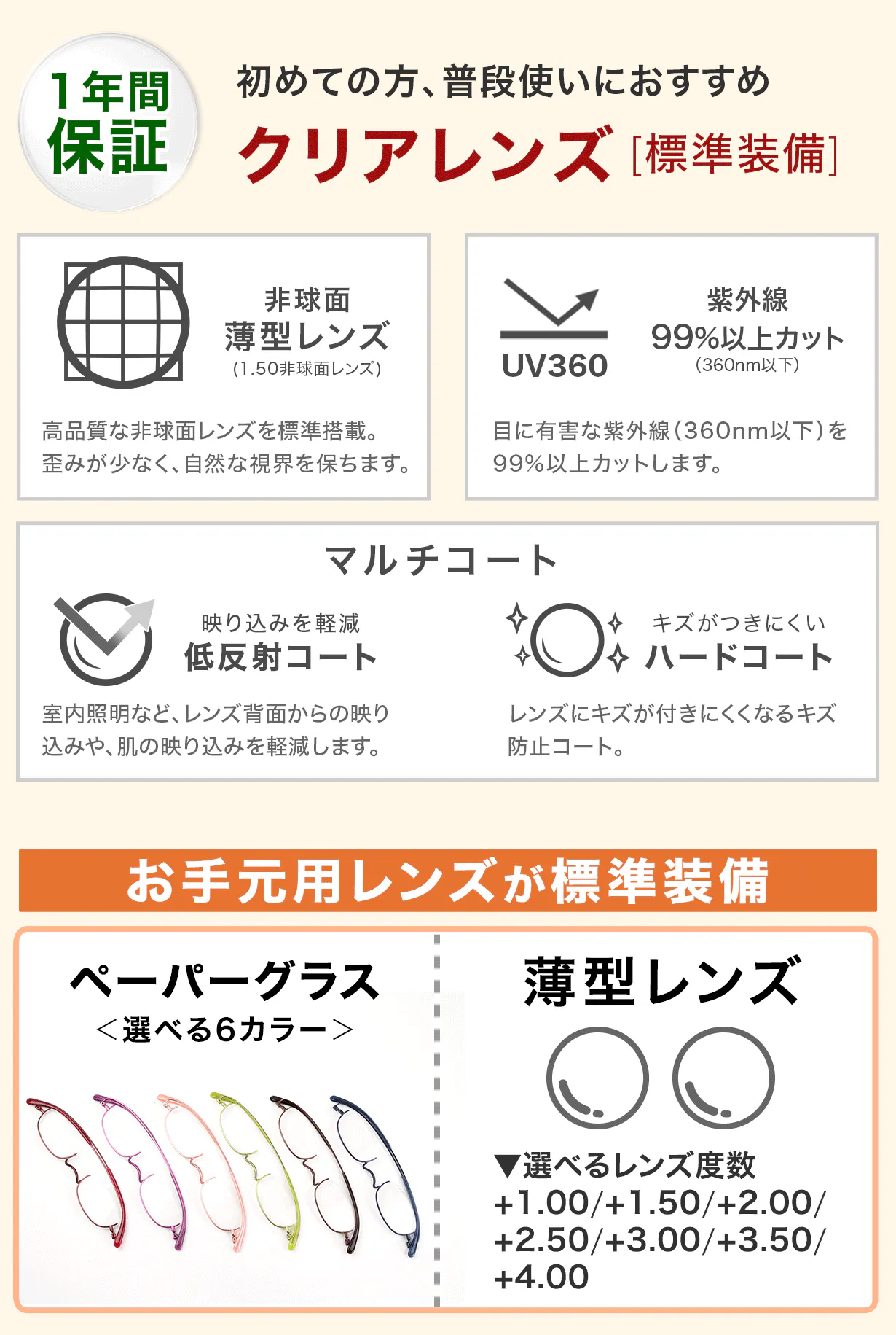 ※標準レンズ度数: +1.00、+1.50、+2.00、+2.50、+3.00、+3.50、+4.00に限ります。※送料はご負担いただきます。※レンズに汚れ・キズがある場合や、商品を弊社へご返送いただいた時の状態がお届け時と著しく異なっていた場合は有償となる場合がございます。