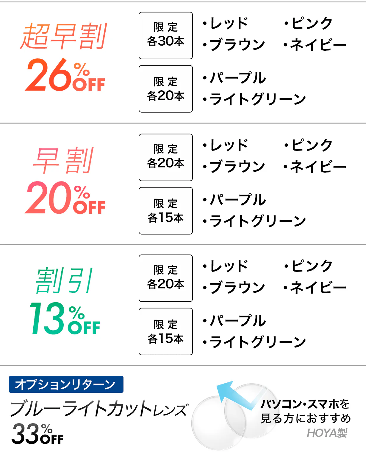 また+1.25や+1.75などのブルーライトカットレンズご希望の場合は、お見積となりますので、【オプションリターン】ブルーライトカットレンズの購入はしないようにお願いいたします。