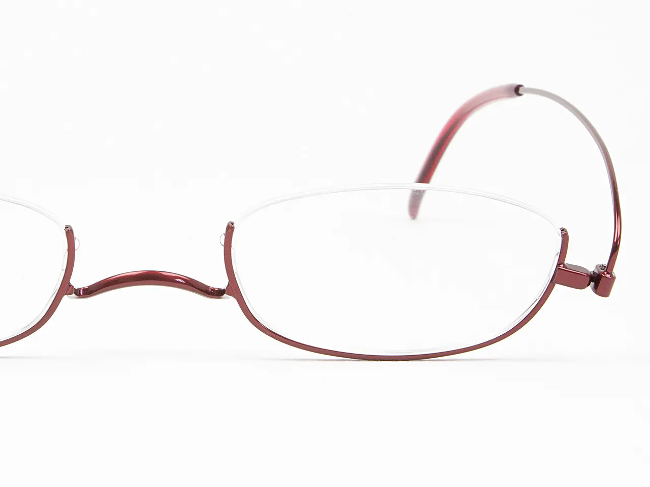 ペーパーグラスの現行モデルは、老眼鏡の持ち運びの煩わしさを解消するために携帯性を重視して作られました。使わないときは薄型になるという構造を実現するため、独特な美しいアーチを描くテンプルを採用しています。