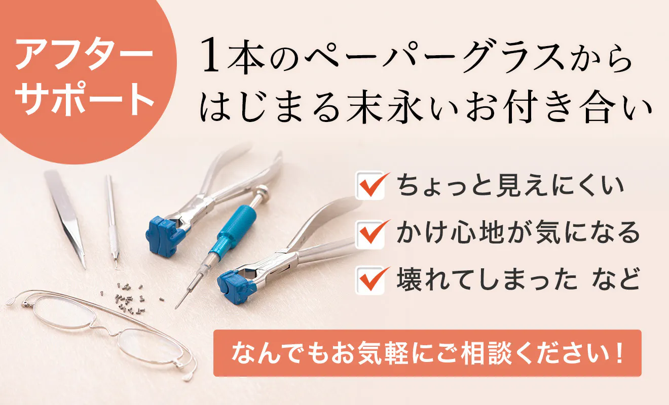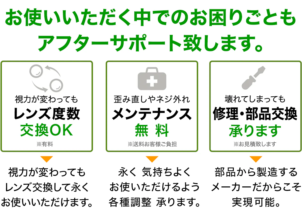 お客様に寄り添い、メガネライフをサポートするブランドとして、ご購入いただいてから永いお付き合いがスタートすると私たちは考えています。私たちは企画・設計・部品の製造から行っているメーカーですから、ご購入から時間が経っていても修理・メンテナンスなどアフターサポートはできる限り対応いたします。