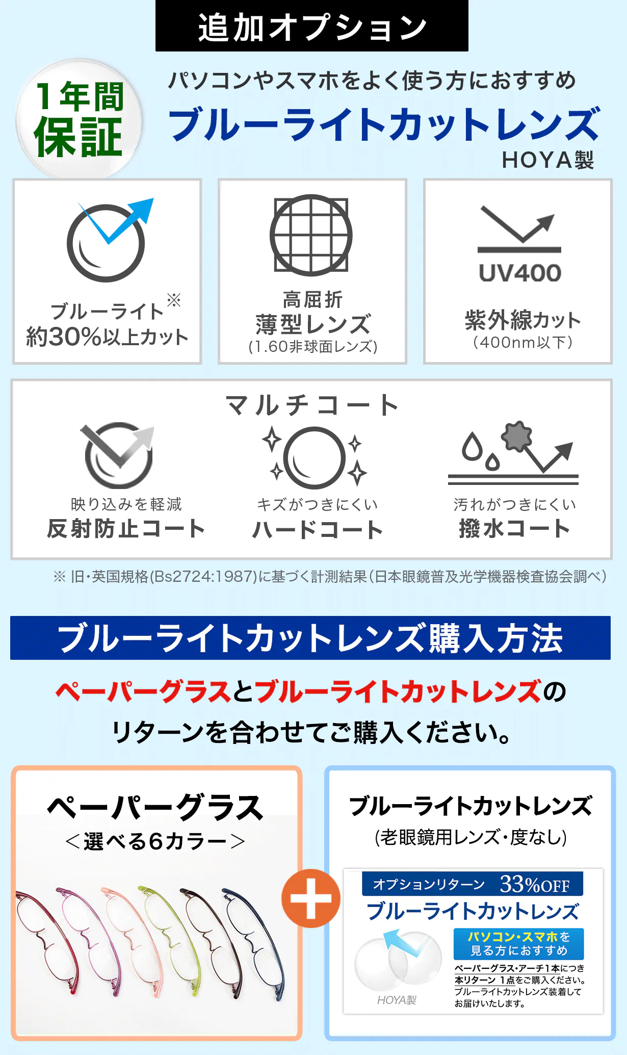 ※ペーパーグラス・アーチを購入後、数日経ってから「ブルーライトカットレンズ」を購入いただいた場合でもブルーライトカットレンズ仕様でお届けいたします。
