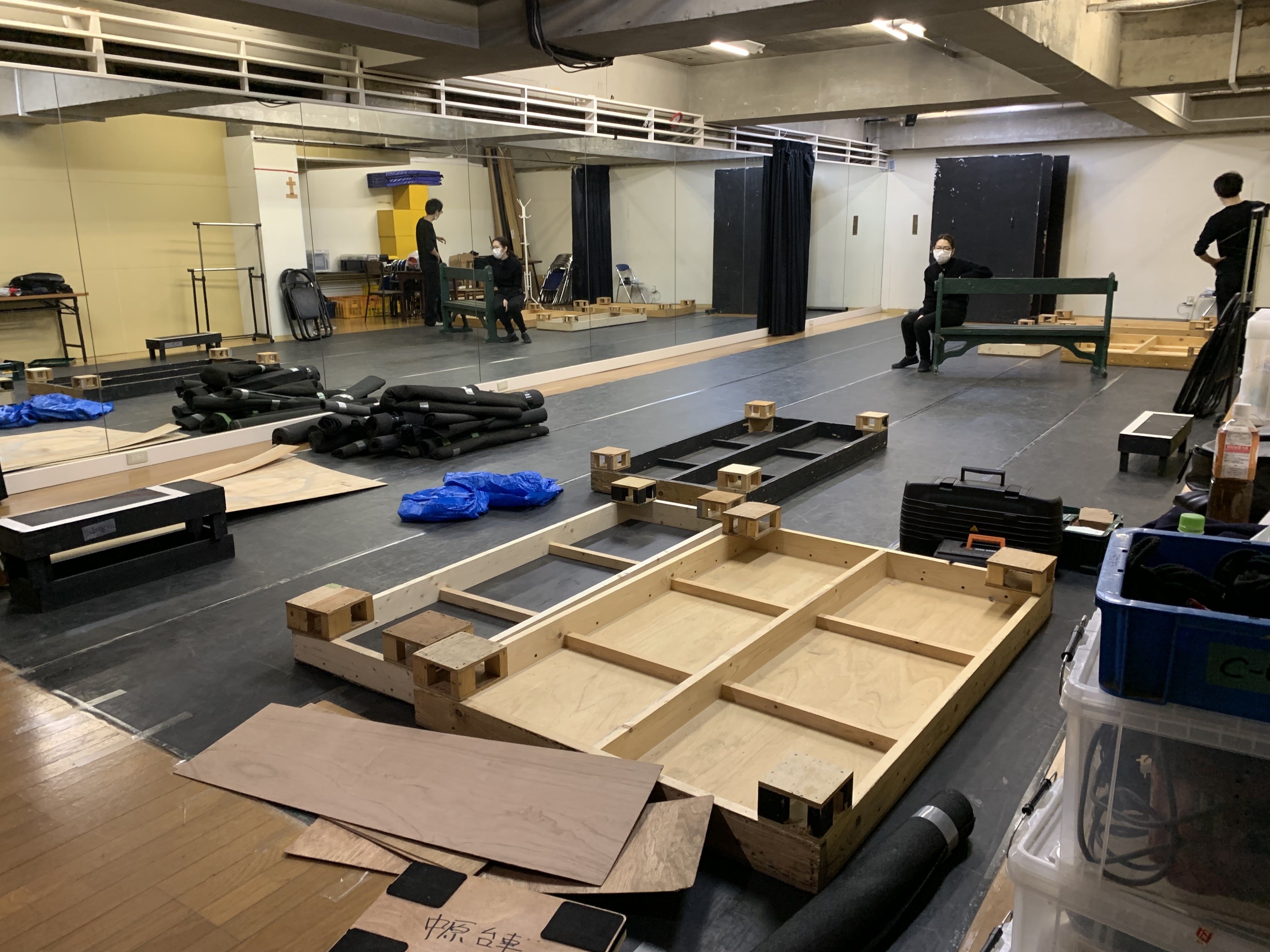 今朝は少ない人数の中、大きなものをとにかく運び入れ、床に敷くリノリウムを張り巡らせて、大道具もの設置も全て完了させました。