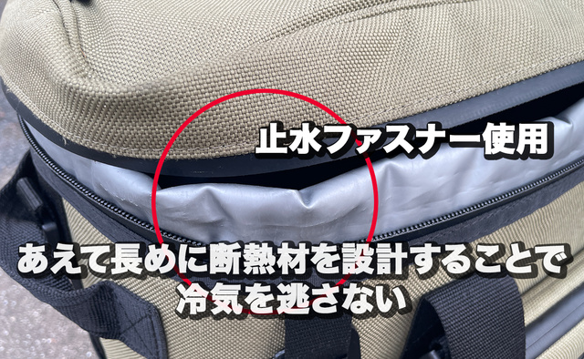 開け閉めするときの冷気の漏れを抑えるため、断熱材をファスナーの上まであえて長めにしました。