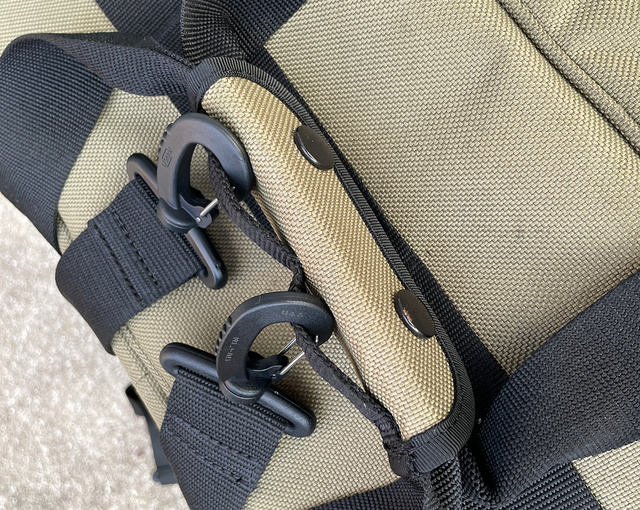 ショルダーベルトを1本だけ使い、両サイドの留め具に引っ掛けるだけでショルダー仕様に。