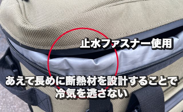 止水ファスナーを使用することで、内側の冷気が外に逃げにくいだけでなく、外からの水の侵入も防ぎます。