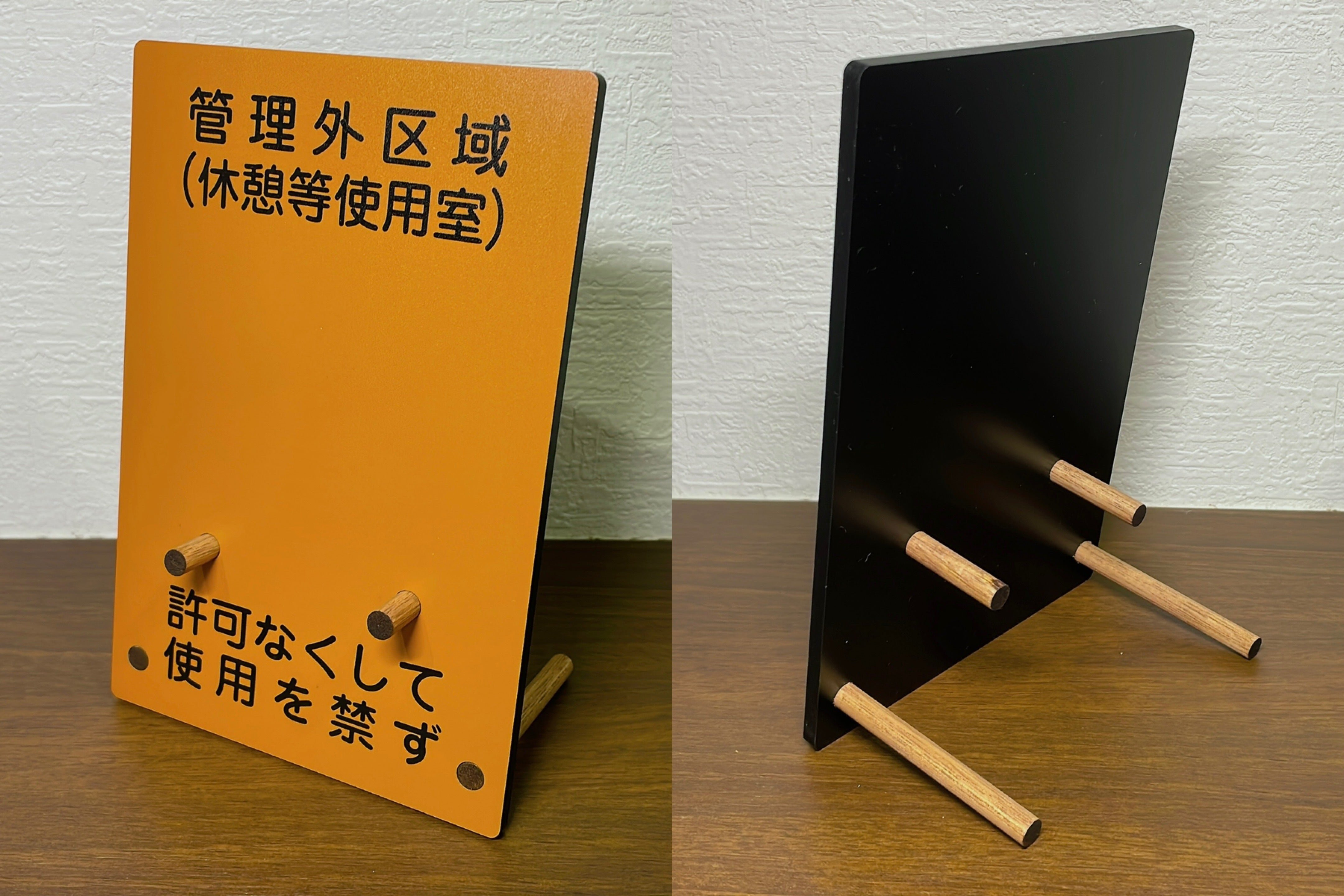 スタンドに記載する文字のデフォルトは「管理外区域」や「休憩等使用室」など実際の標識とは異なる文字を使用してパロディ感のある作品にしましたが、放射線の標識をイメージした作品です。