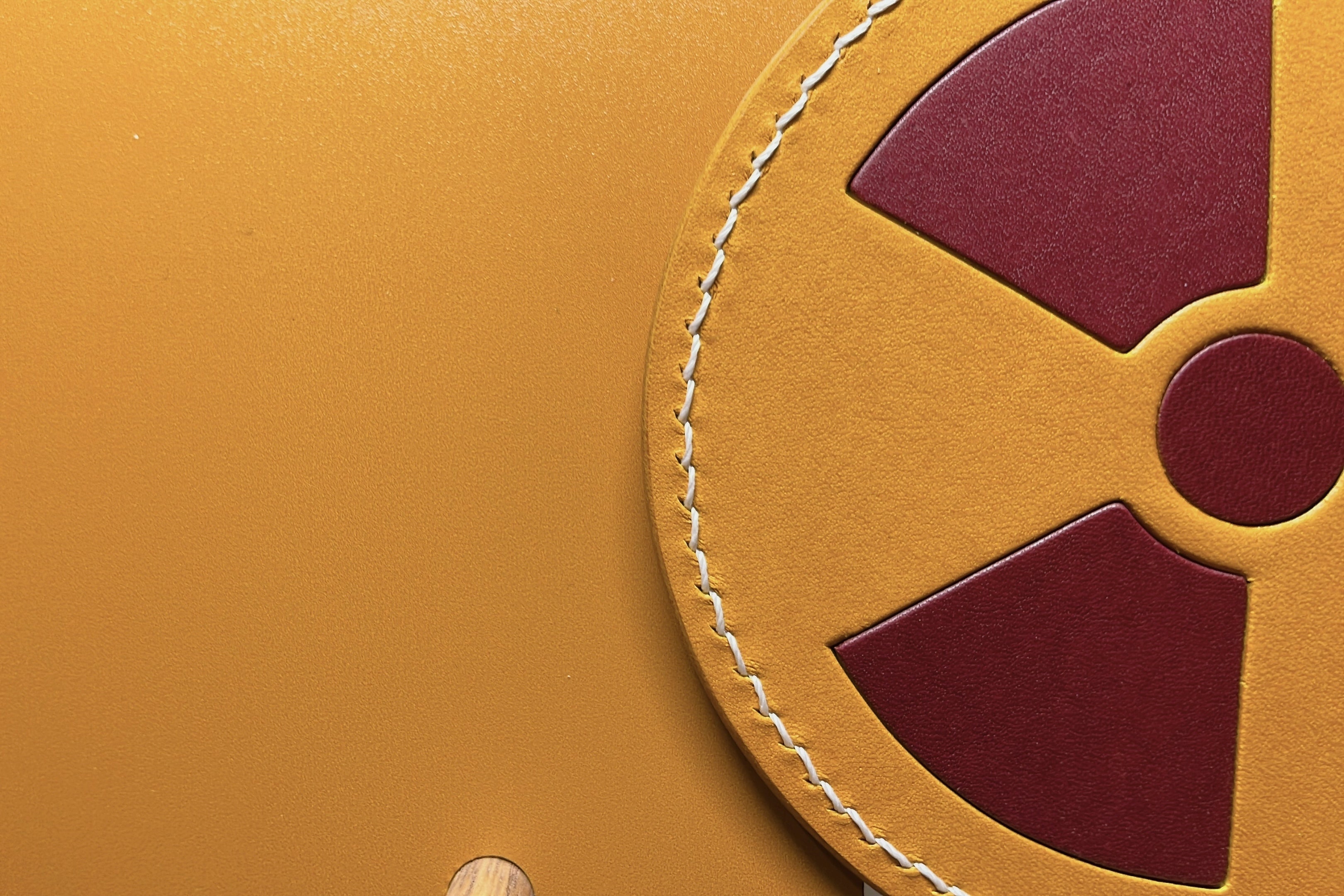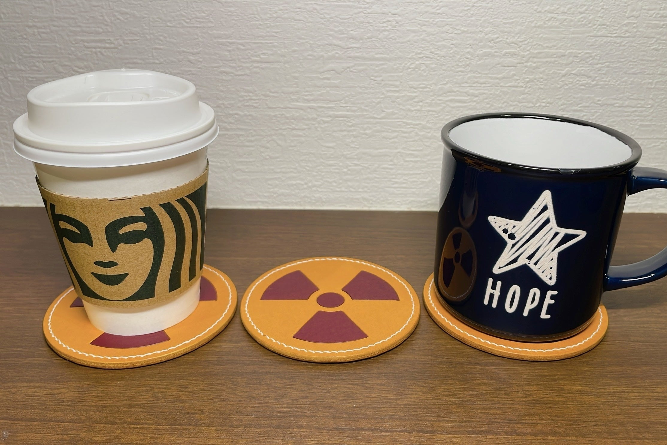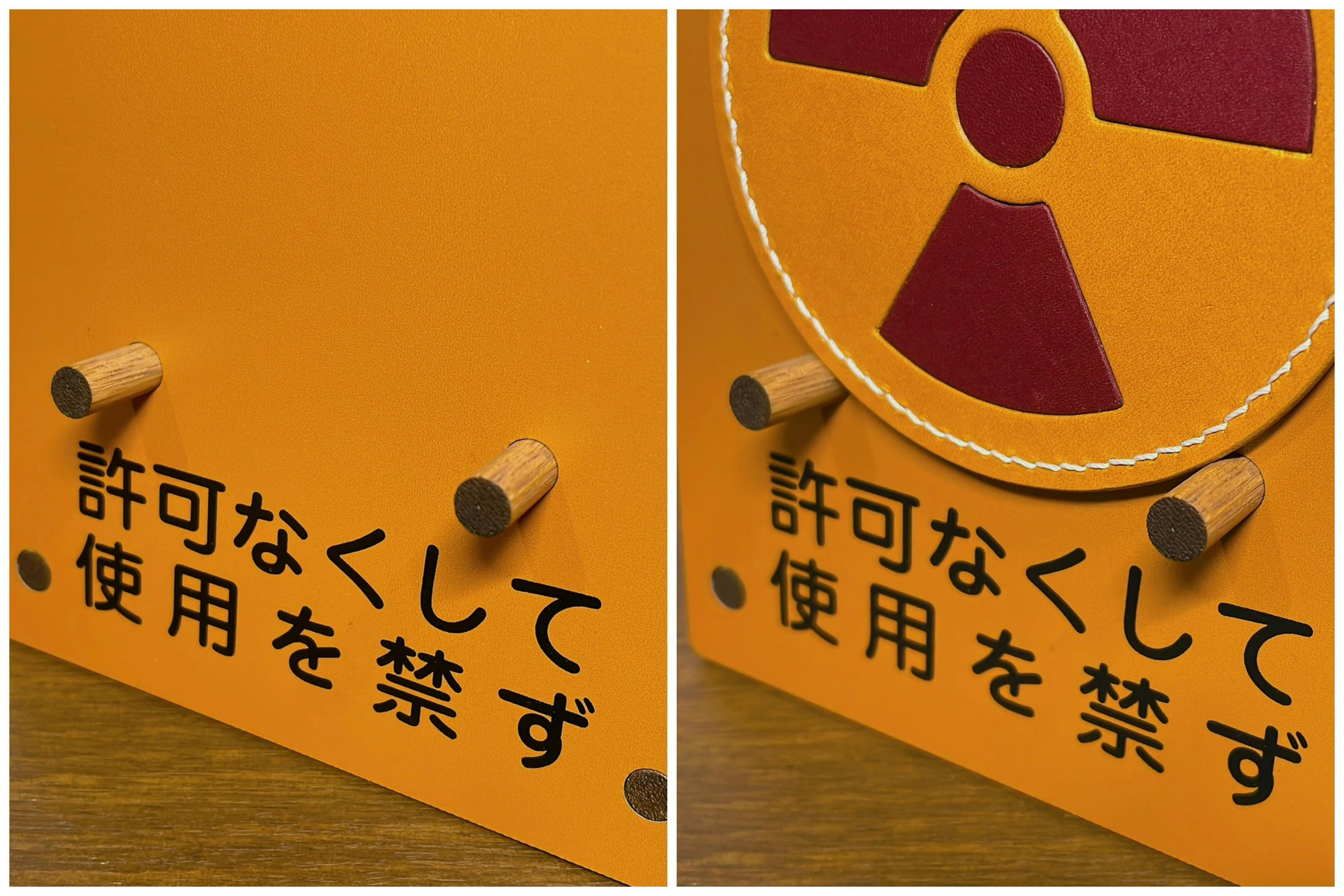 木目のアクセント×クラッシックなレザーの親和性が高く、放射線標識のマークなのにコーヒーの入ったマグカップとも違和感がないオシャレな印象になりました。