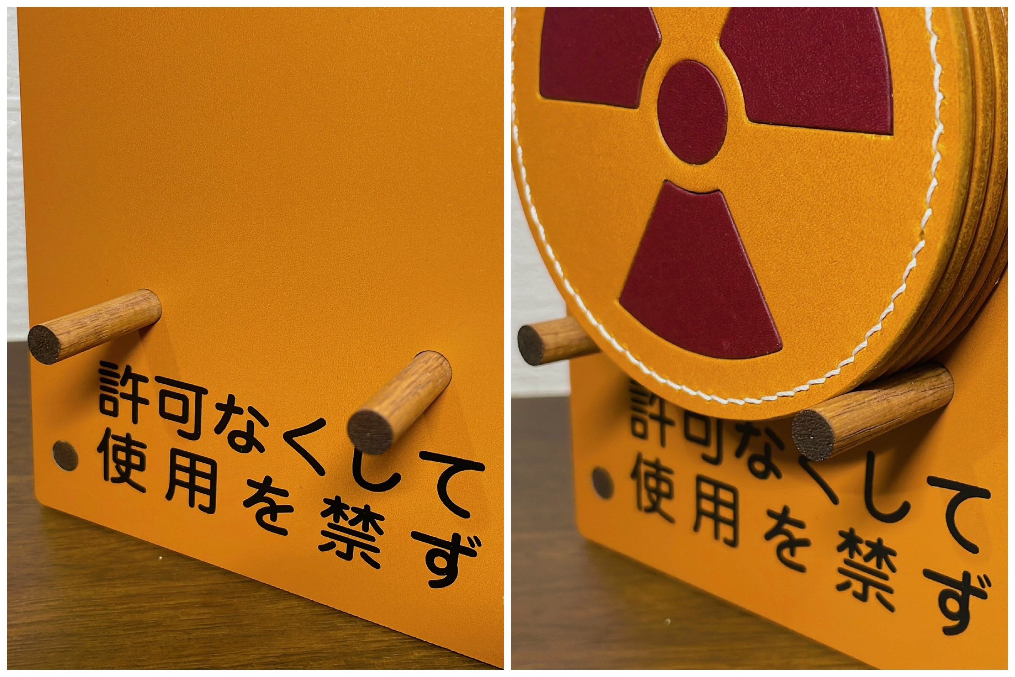 本物の標識と同様の比率なるように、コースターにある放射線のマークのサイズに合った大きさのスタンドを製作していただきました。