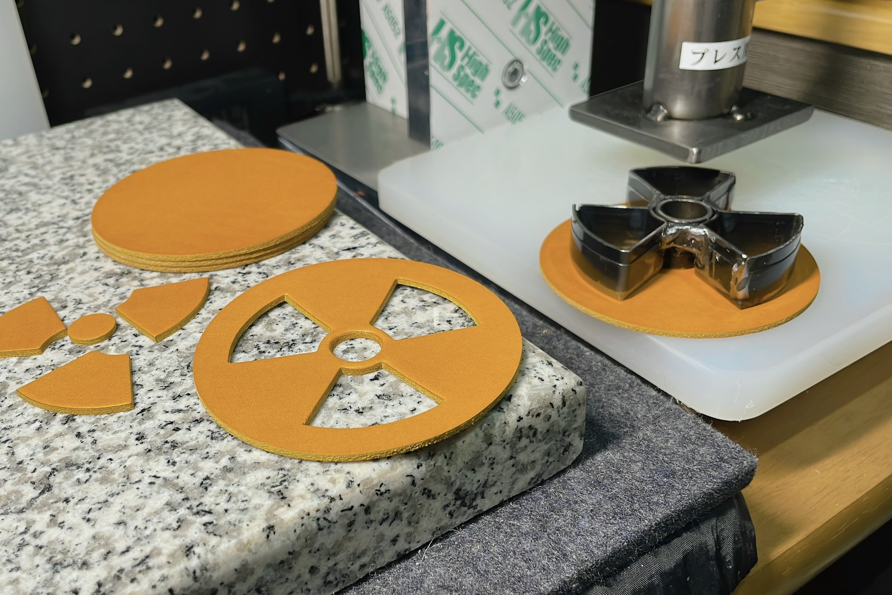 今回はこの作品のためにプレス機を購入し、抜き型を使用し革を切り出して作製しています。
