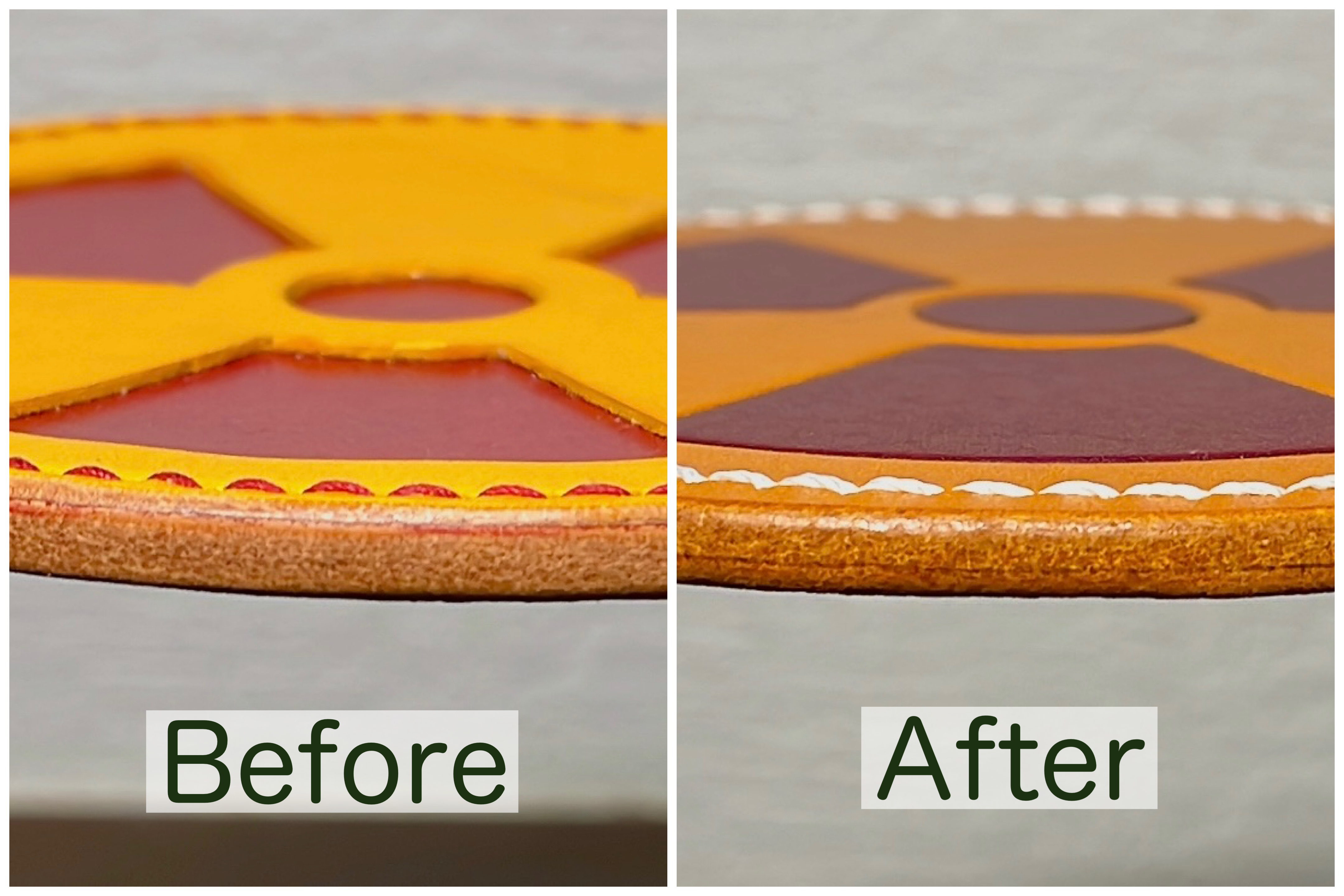 しかし、今回のコースターは土台となる革の上に同じ厚みの黄色と紫の革をパズルのようにはめ込んで作成するため コースターに段差がなく飲み物を置いてもガタつきがありません。