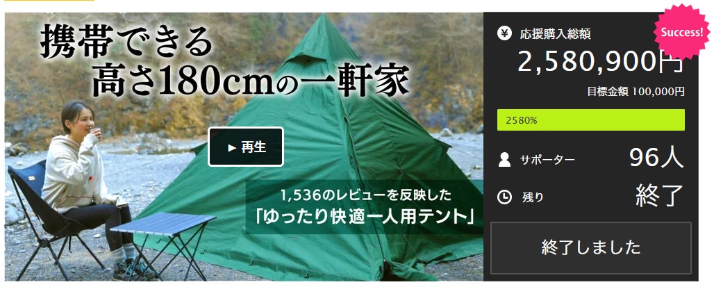 2022年5月、クラウドファンディングで多くの支援をいただきました!『ゆったり快適一人用テント』