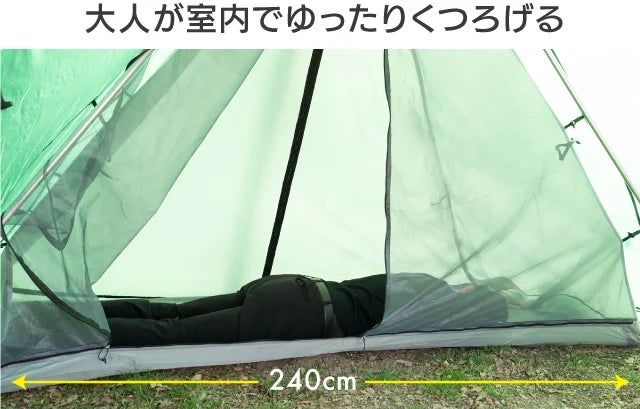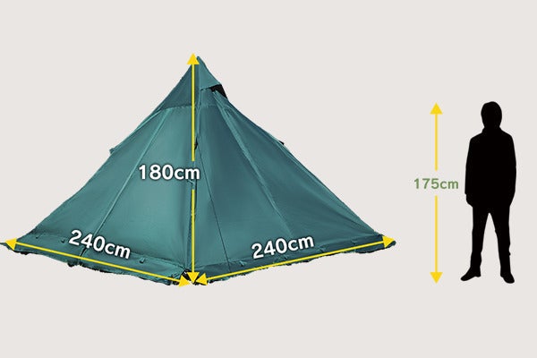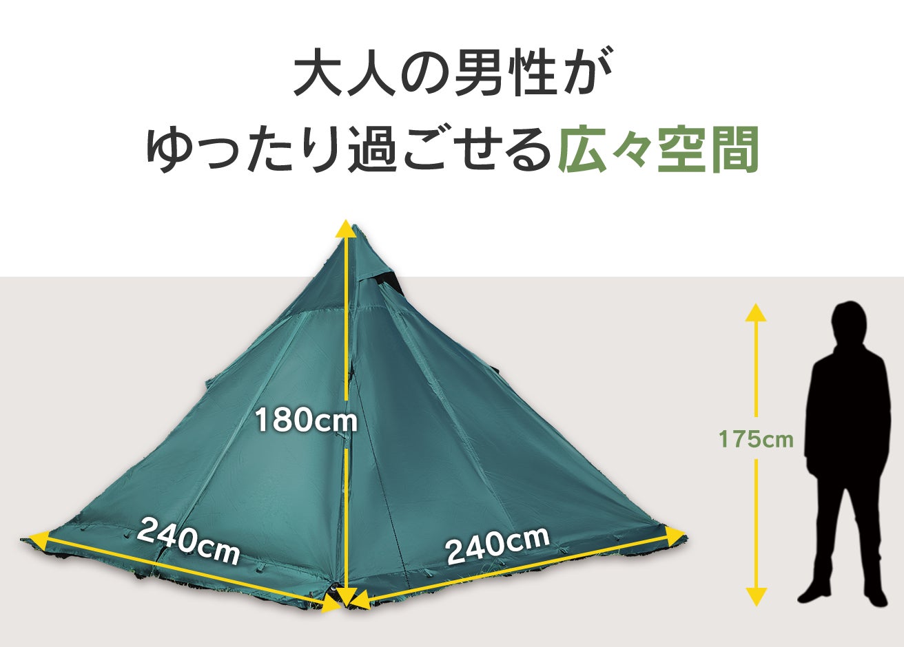 【ゆったり快適一人用テント】はソロキャンプ用にも関わらず、高さが何と180cm、横幅が240cmあるティピー型のテントです。 テントの出入りもスムーズに行えます。