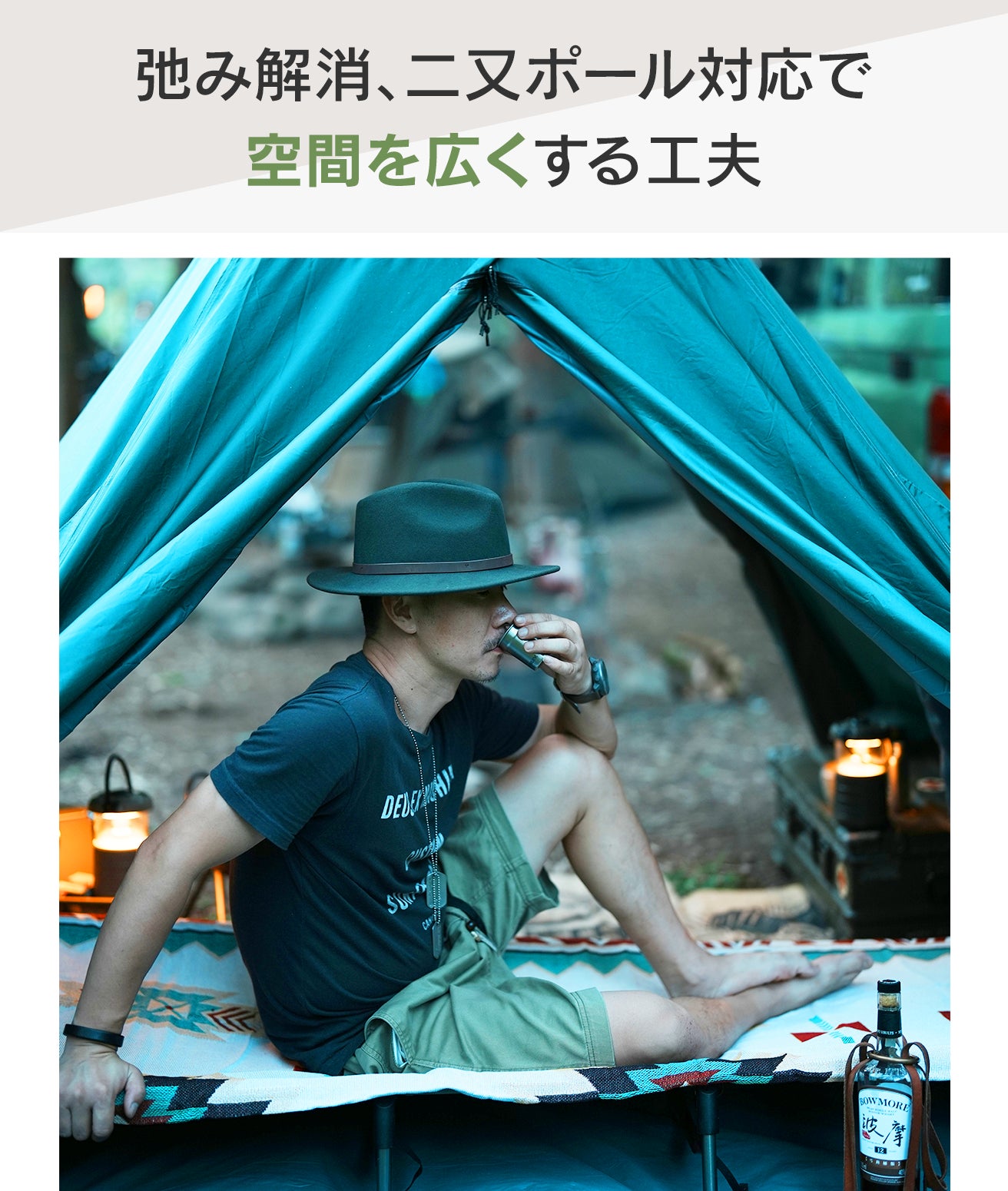 しかもティピー型であるにもかかわらず、【ゆったり快適一人用テント】のモノポールは二又対応も可能なので、中央のポールが消えて空間は広々。