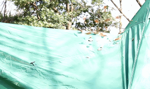 フライシートの四方をペグで固定し、中央にモノポールを入れて立たせるだけなので、女性一人でも楽々組み立てられます。
