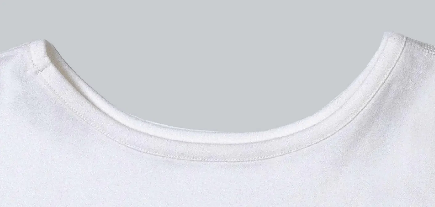 普通のTシャツの衿はクルーネックという形状になるのですが、これだと前は深く、後ろは浅くといったように前後で差をつけないと見た目に不自然。