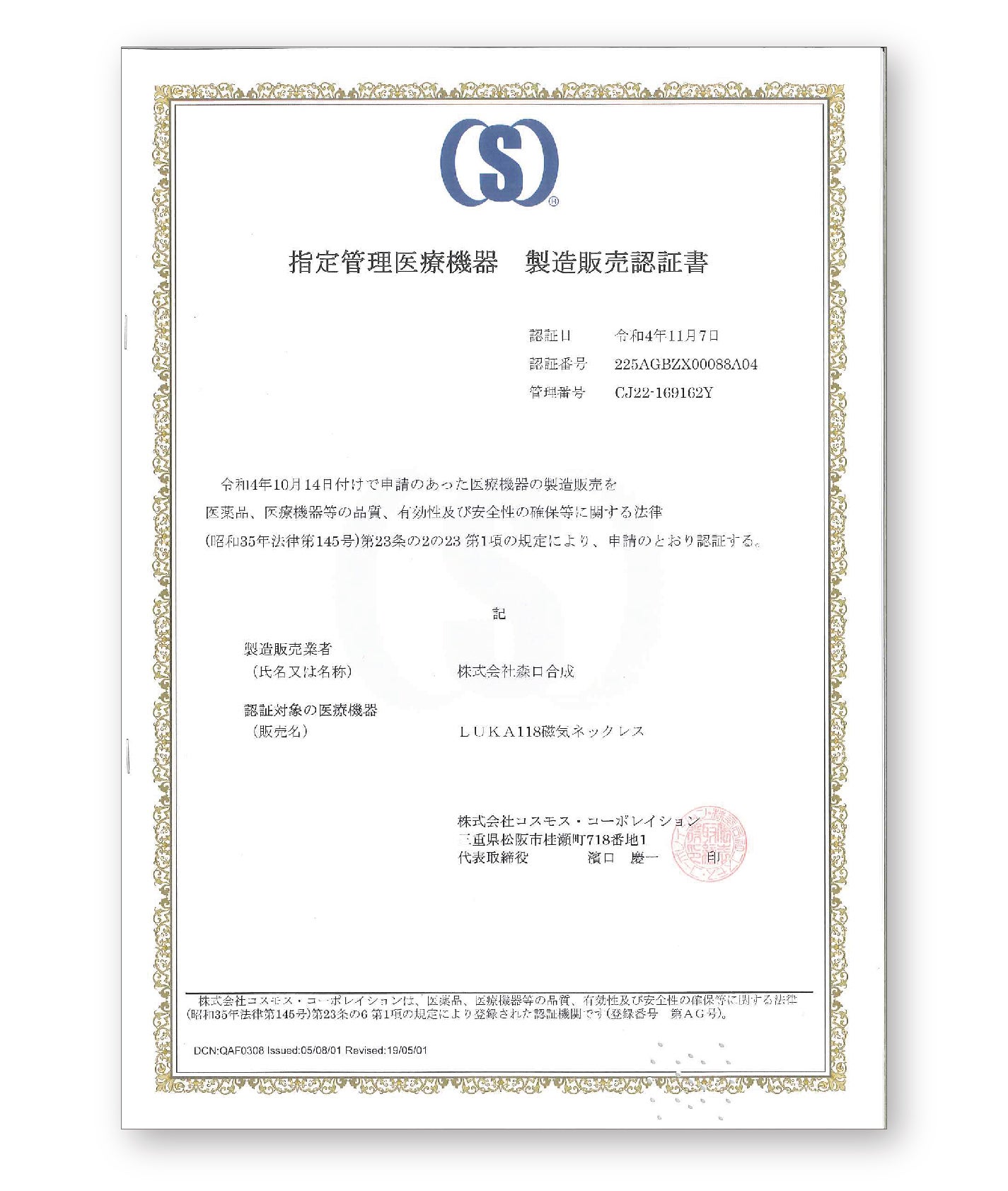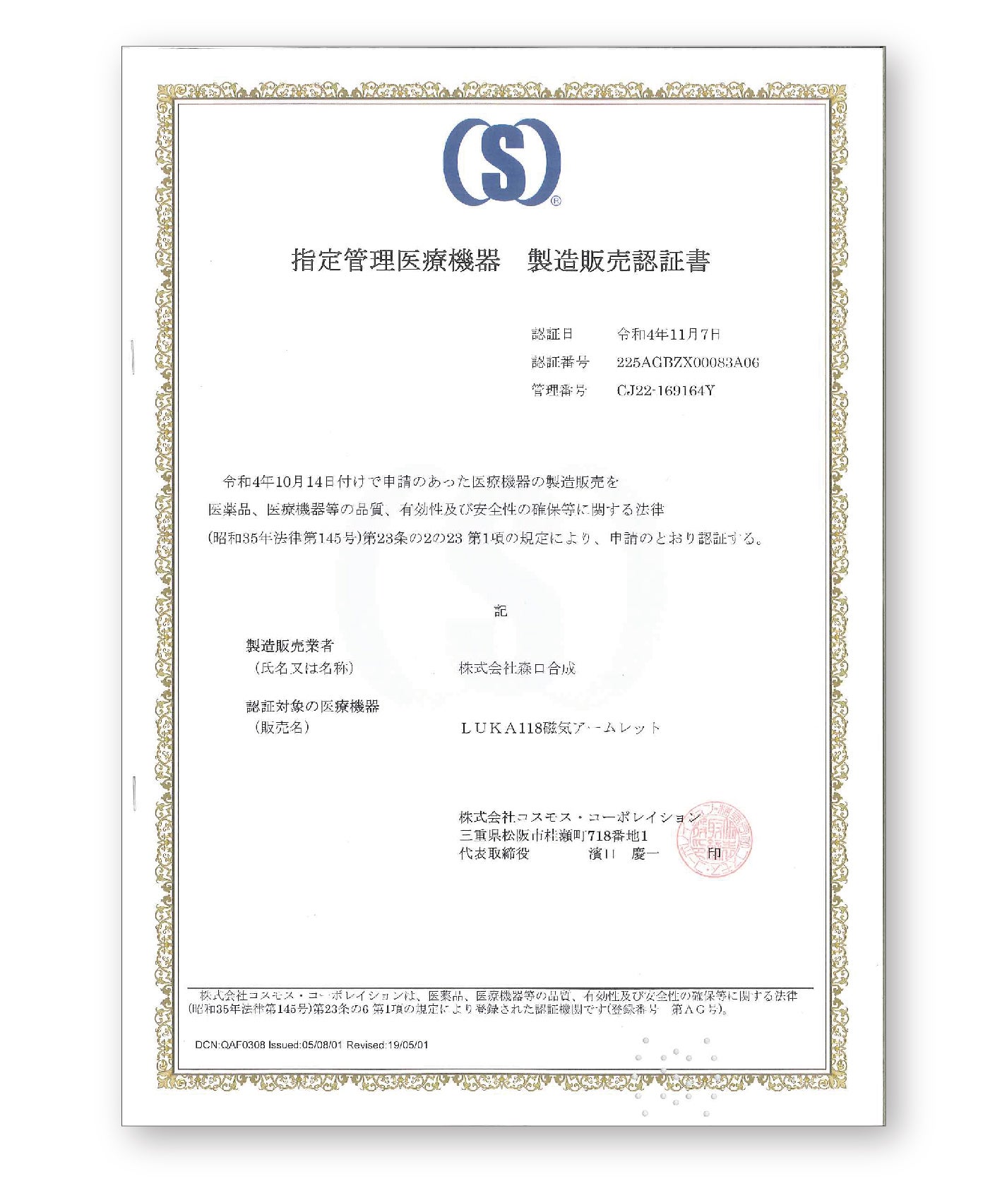 治療や予防を目的として使用される医療機器に分類される『L.U.K.118』。医療機関で使用される検査機器などと同様に適切な取り扱いが必要でありながら、管理者を置く必要がなく、家庭での使用が認められている家庭用管理医療機器の認証を取得しています。