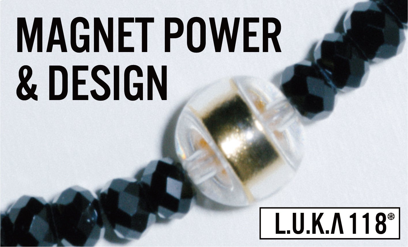 磁気によって血行を促進し、体の痛み・コリなどの改善に幅広く用いられているマグネット。精神の安定や運気アップなどにもつながるとされる天然石。それぞれのパワーを最大限に生かしつつ、洗練されたデザインにこだわった『L.U.K.A118』が、フィジカル&メンタルをファッショナブルにサポートします。
