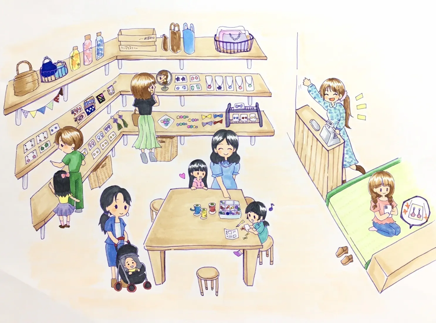 ハンドメイド作品作りの体験ができる小上がりスペースを設置。