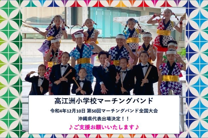 私たち、高江洲小学校マーチングバンド部は、平成21年度創部の歴史の浅いチームで2年生~6年生まで15人が在籍し、指導者やスタッフ、保護者に見守られながら、今年度は『自分達が満足できる演奏演技をして、全国大会で金賞をとる。』を目標に日々の練習に取り組んでいます。