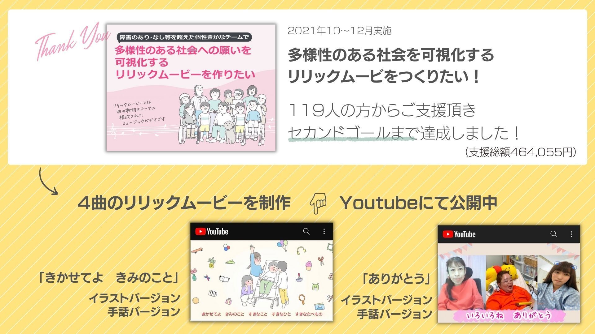 私たちの初の制作となったこの企画は、119人に方からご支援を頂いて、2つの楽曲「きかせてよ きみのこと」「ありがとう」(手話バージョンもあり)を制作!