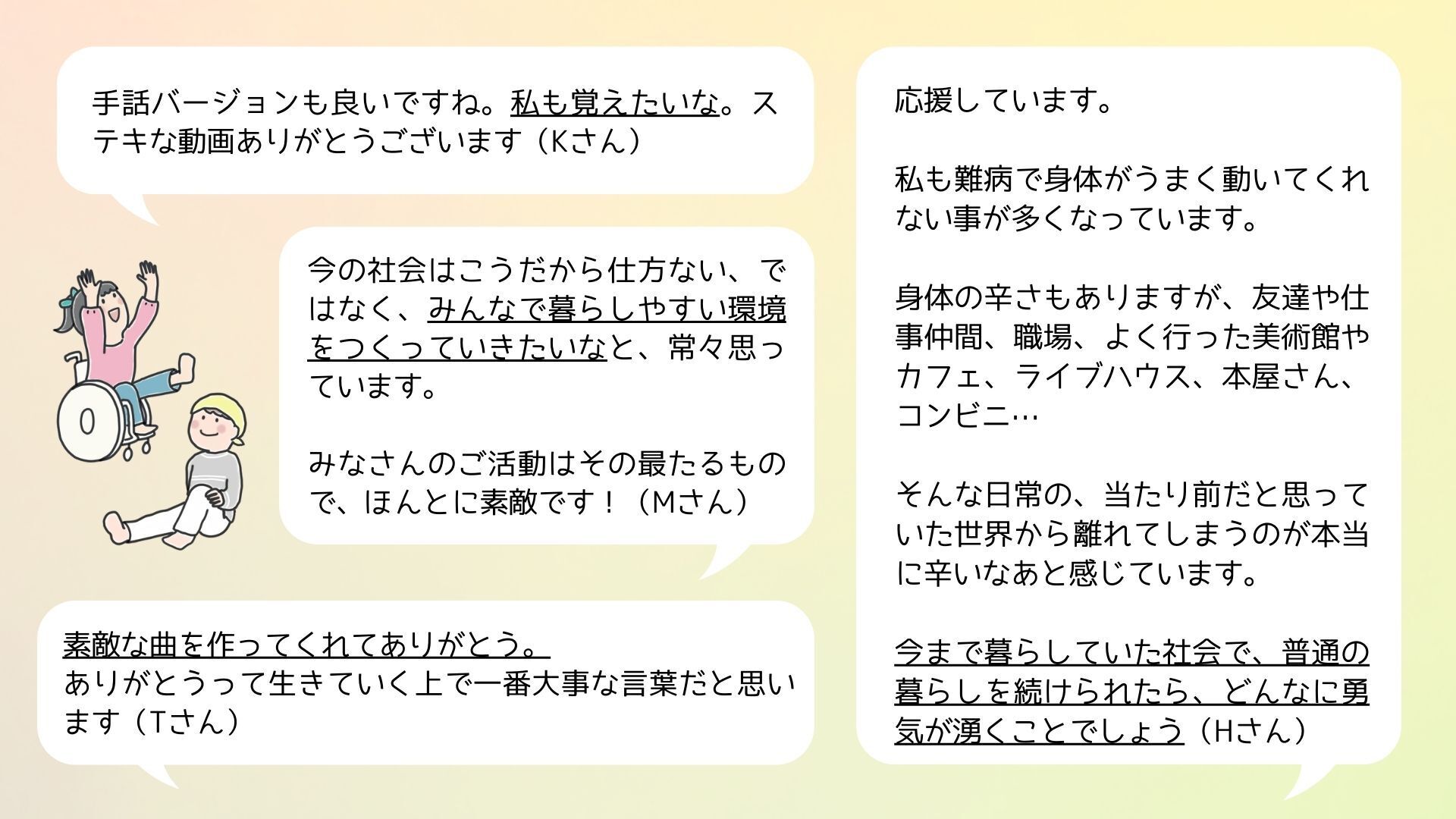 障害を持った私たちが必要以上に我慢を強いられる社会にこの曲・この曲の言葉たちがはばたきますように…