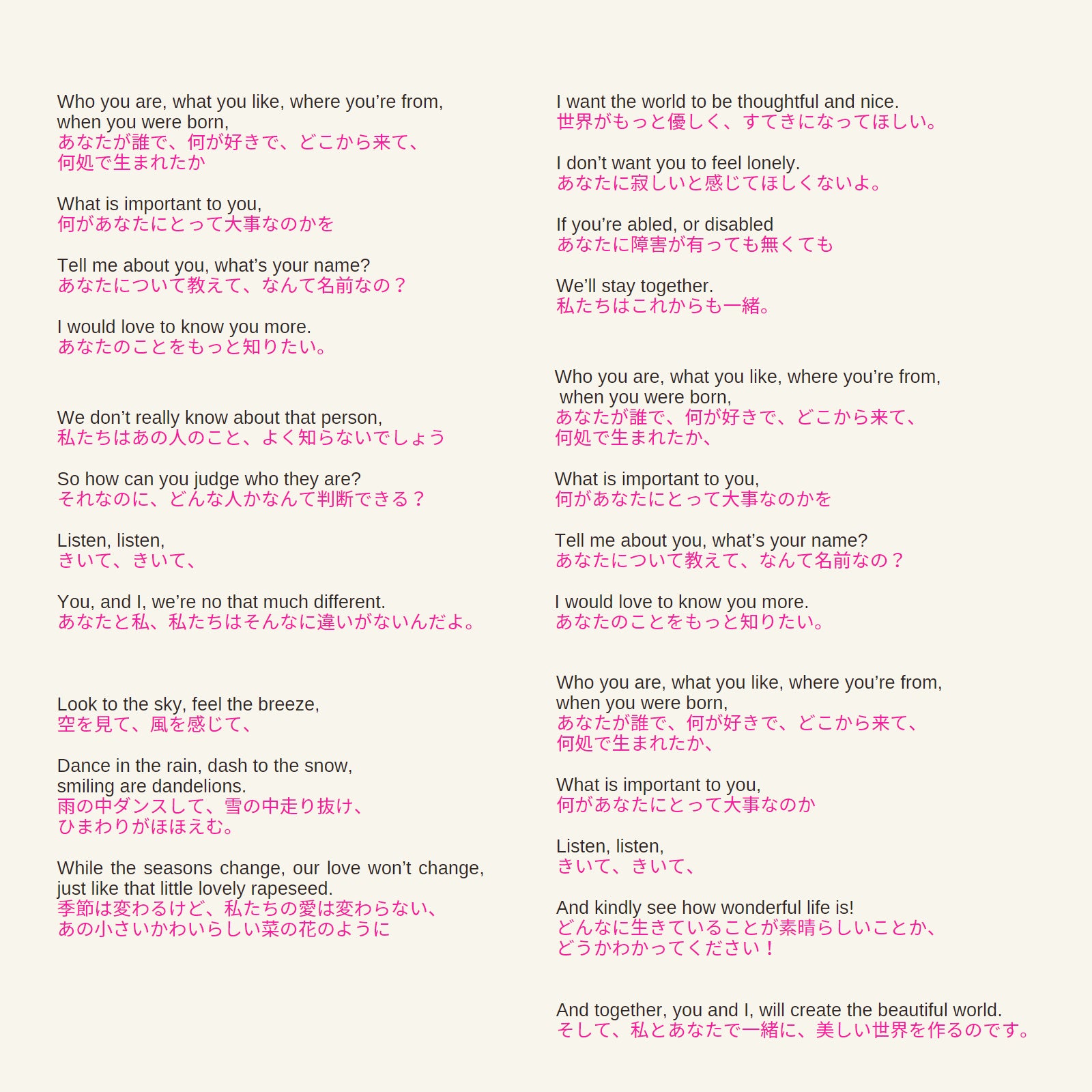 ※「きかせてよ きみのこと」の日本語バージョンの歌詞はこちらから