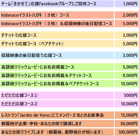 「きかせてよきみのこと」(英語版)および「ありがとう」(英語版)のリリックムービーの最後に「クラウドファンディングご支援」としてお名前を掲載します。※備考欄にリリックムービーへの記載時のご希望のお名前を必ずお書きください