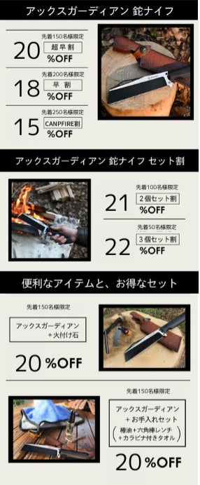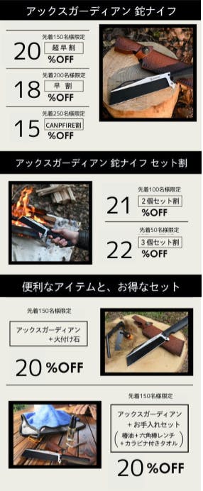 2023/02/14 17:58CAMPFIREもうすぐ終了いたします。残り4日となりました。 この鉈ナイフはコンパクトなのでとても便利です。 バイクでキャンプに行く時も荷物がかさばらず助かっています。実はこの鉈ナイフを多くの方に知ってもらいたくて、ネット広告で鉈ナイフの良さをお知らせしようとしましたが武器とみなされてお知らせすることができず苦労しております。 もしよろしければ皆さんのご友人やお知り合いの方にお伝えしていただけると嬉しいです。 今、応援購入いただきましたら春キャンプに間に合いますし20%OFFでGETできます! ただいま21人の方にご購入いただいております。 たくさんの応援ありがとうございます。皆様のおかげです。 皆様のキャンプライフをさらに充実し楽しいキャンプの後押しができたら嬉しいです。 購入はこちらから↓↓ ↓ https://camp-fire.jp/projects/640046/activities/448785#main もっと見る皆様のご支援ありがとうございます。