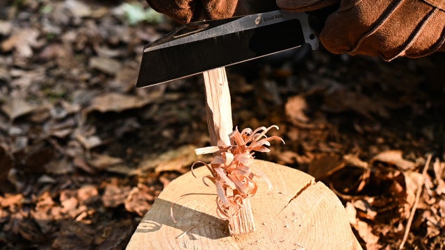 アックスガーディアンは中央付近からストレートに刃付けされた形状になっています。そのため、薪へ適度に刃が食い込みやすく、フェザースティックの作製が簡単に行なえます。