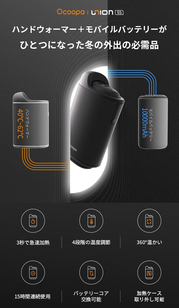 Union 5sはバッテリーコア「Union Core」と加熱ケース「Union Case」で構成されるモジュール設計です。電源をオンにするとUnion Caseが3秒で加熱し、真冬の屋外でもすぐに手を温めることができます。