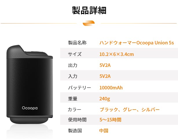 「Union 5s」はモバイルバッテリーにもなるハンドウォーマーです。フル充電1回で最大15時間連続使用できるだけでなく、10,000mAh大容量のモバイルバッテリーとして外出先でスマホなどを充電することもできます。冬の外出に欠かせない1台2役の便利な商品です!
