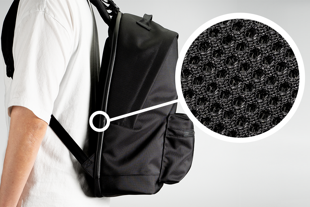 バックパックを使用する中で意外な盲点として挙げられるのが、「バックパックと服が擦れ服が傷む」ことです。ZENでは、背中部分を優しくフィットする形に設計し、服へのダメージ軽減効果を期待できる作りにしました。