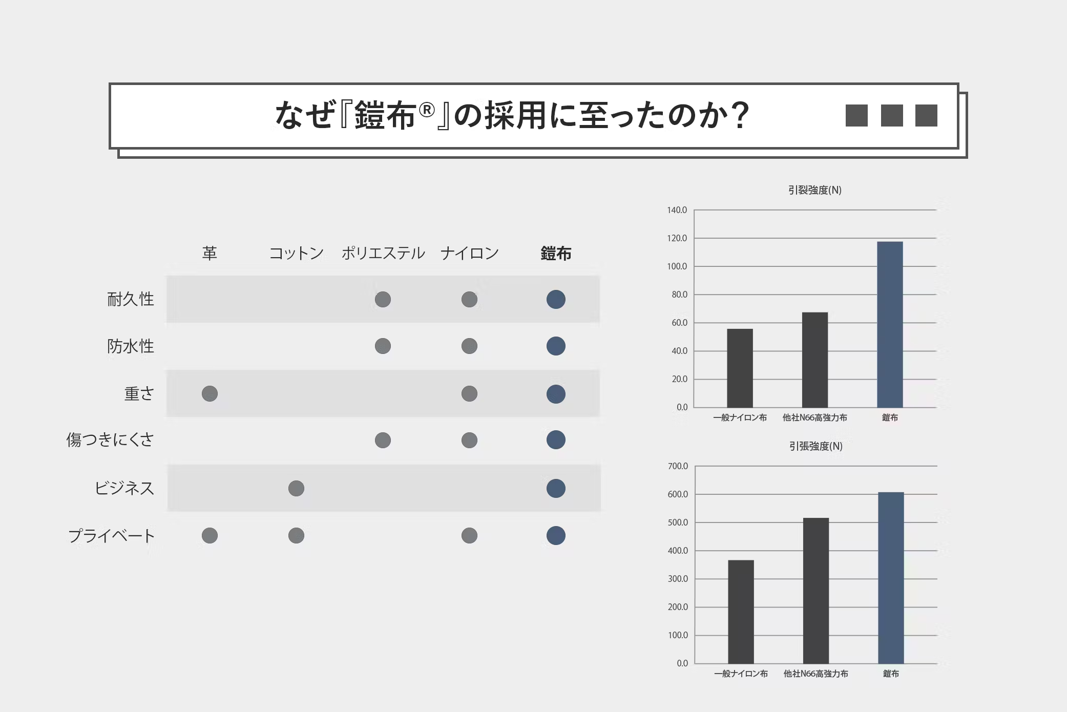 ・利用シーン:強度の高い生地によくある独特な模様等がなく、ビジネス、プライベートどちらにもなじみやすい質感を実現