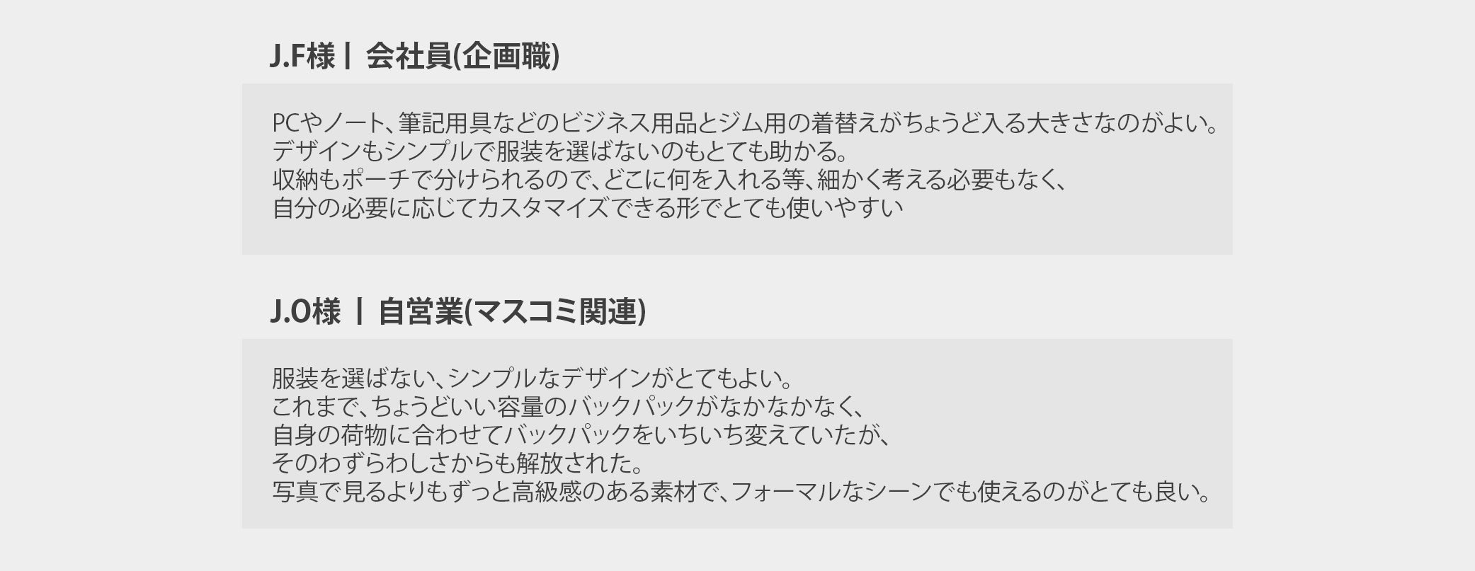 創業のきっかけはメンバー自身が抱えるバックパックへの悩みからでした。TPOに合わせてバックパックをいちいち変えなければいけないわずらわしさ、高機能・高耐用性と謳われながらも、いざ使ってみると1~2年でボロボロになってしまい都度買い替える状況。