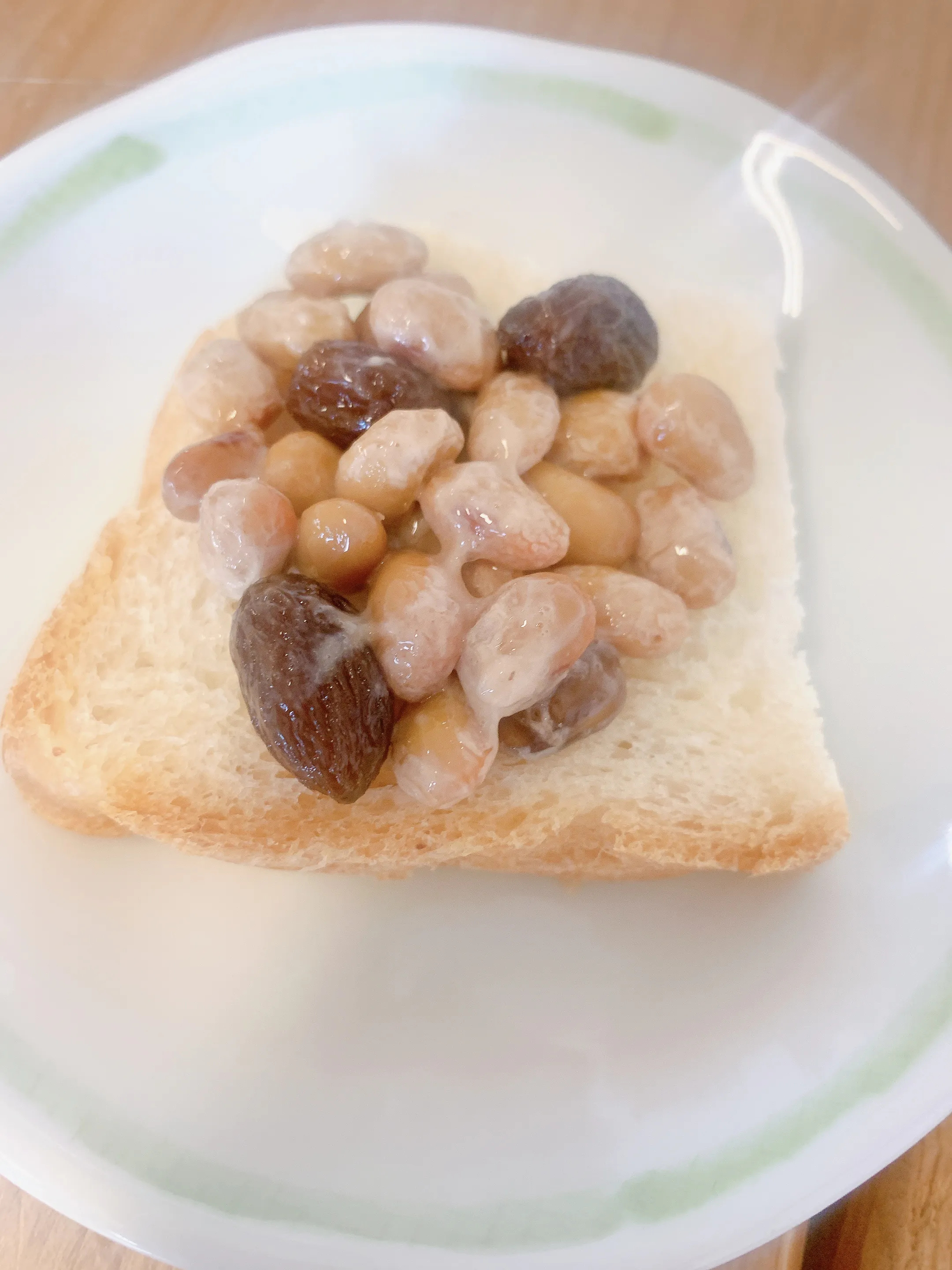 ザ・レーズンの方は、パンにのせて。写真自体は、ただのせただけですので、テーストはどうしましょう?私ならメープルシロップですね。そして、そして、その上に塩を少々ふります。スイカに塩感覚でしょうか。おとなしい味の納豆にフルーティーな粒が口当たるのが嬉しいですね。