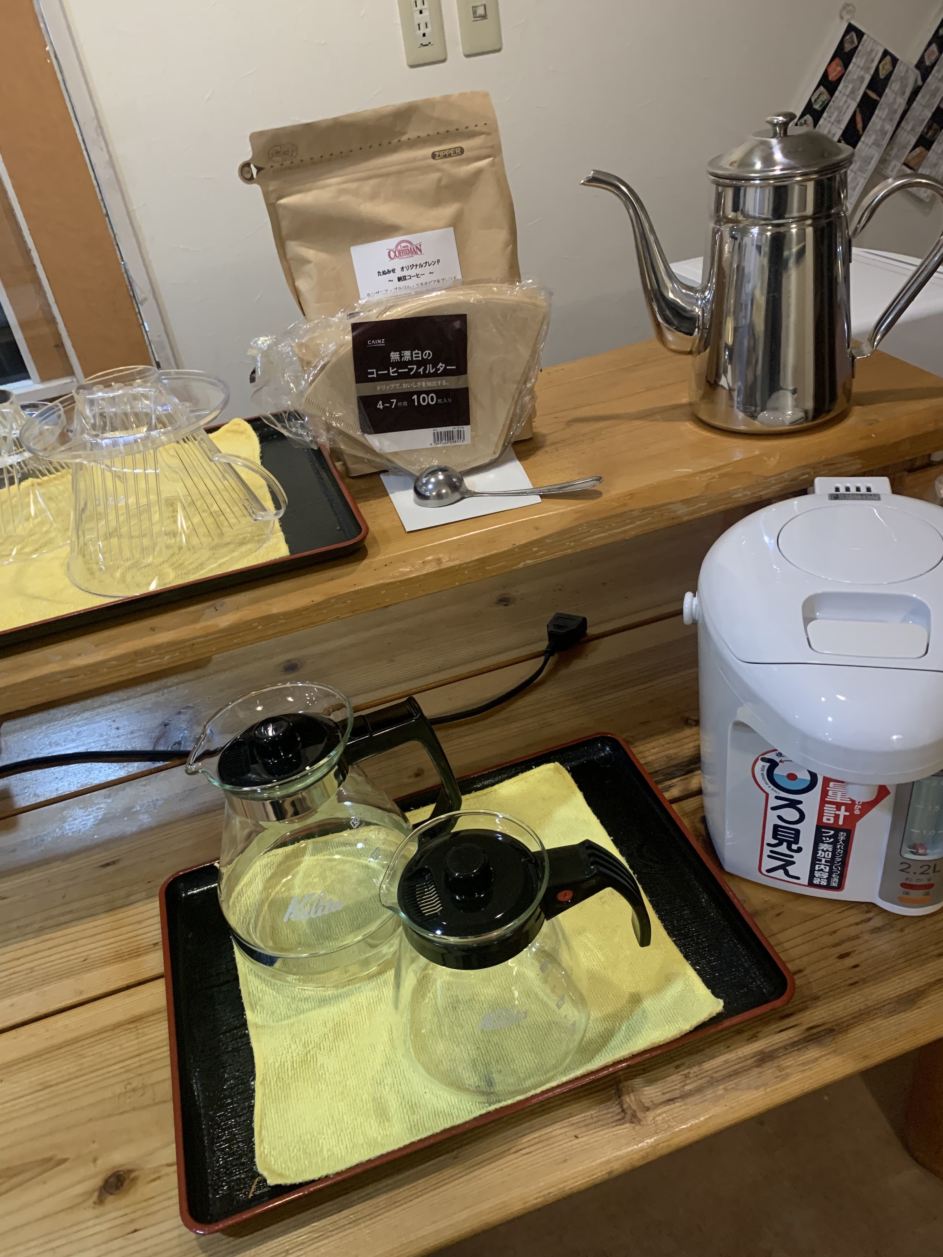 写真は、厨房にコーヒー淹れる道具を設置いたしました。三重県物産展で提供していた美味しい納豆コーヒーも楽しめますね。さあ、元気に頑張ってまいりましょー!