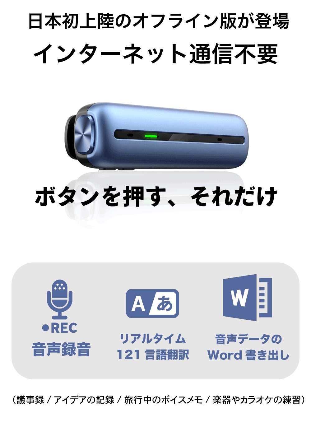 インターネット不要!1ボタンで文字起こし・翻訳・録音を。音声データを瞬時に「翻訳」&「テキスト化」AI翻訳ボイスレコーダー。日本初のオフラインモデル。