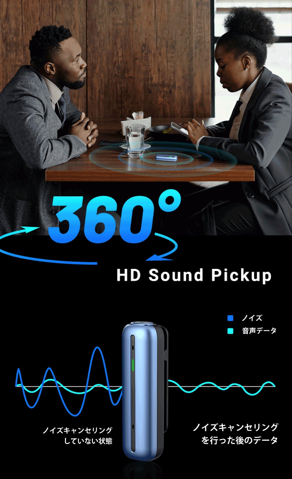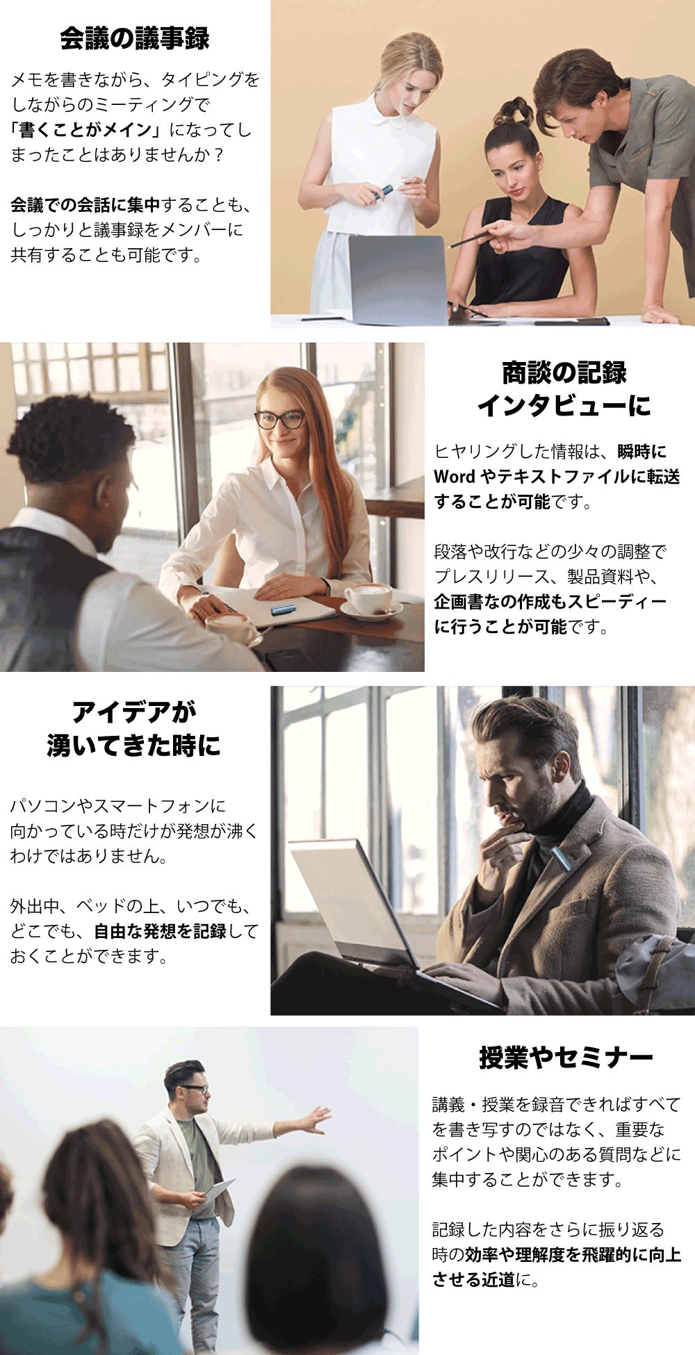 対面式の打ち合わせ、会議テーブルでのさまざまな角度からの音声データの録音など、あらゆる環境で音声を録音することができます。