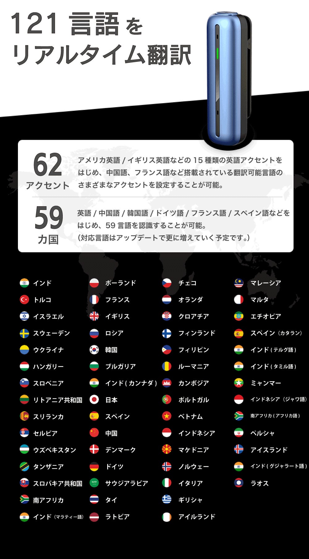 59カ国に加えて62の方言アクセントに対応。様々な言語に対応します。