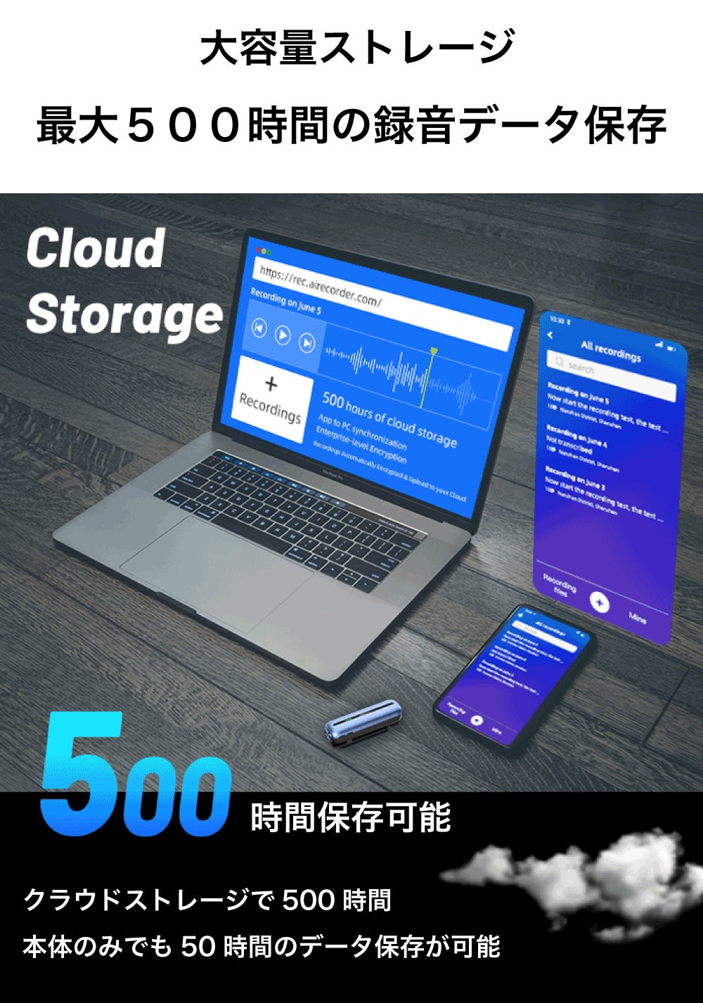 保存できるデータは、インターネットを使った場合のクラウドストレージで約500時間分のデータ保存が可能です。