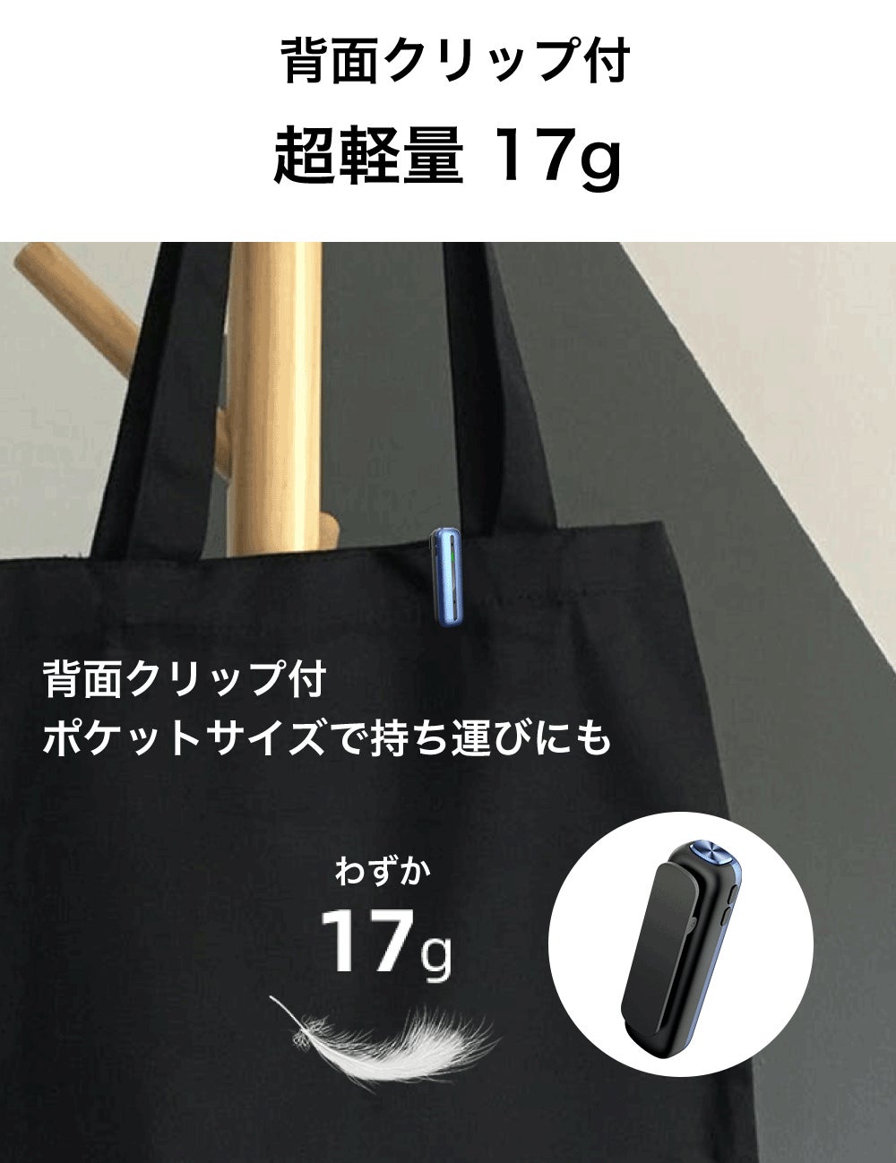 背面クリップ付きのため、バッグにつけたり、スーツやシャツに装着してご利用も可能です。