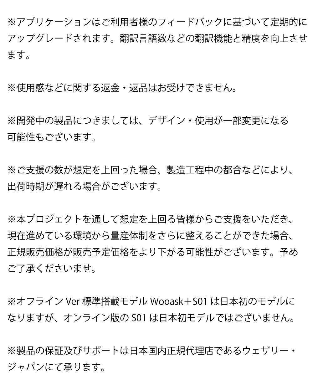 ※リターン品の配送が完了するまで、ウェザリー・ジャパン株式会社はWooask S01の日本における正規代理店です。並行輸入品が発生する可能性がございますが、並行輸入品には正規代理店による製品サポートを受けることができません。また正規代理店を通じて購入することで、日本国内での流通に必要な各種認証の取得や、関税の適切な処理が担保されます。