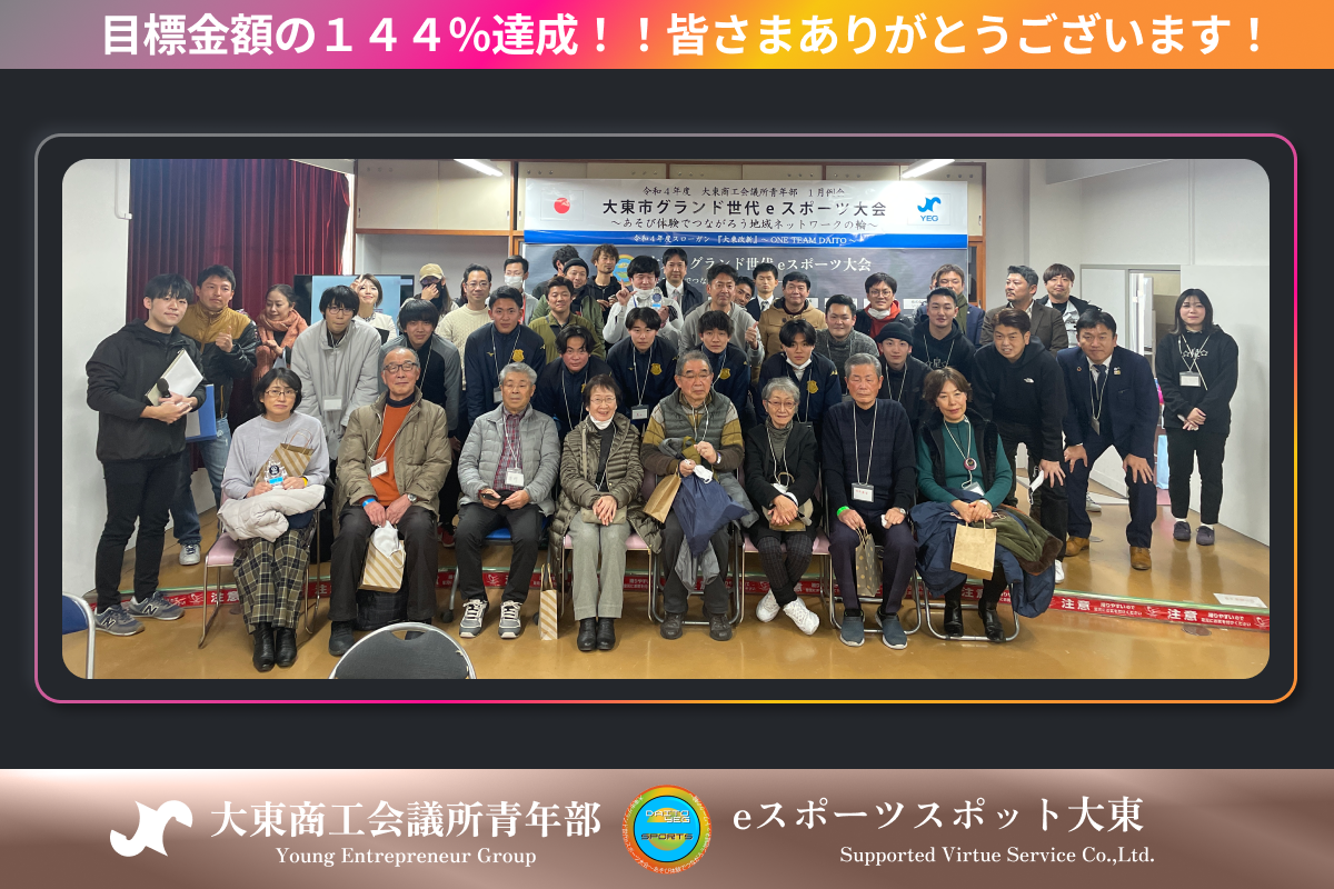 2023/02/28 21:27ご支援者様各位こんにちわ!大東市グランド世代eスポーツ大会を主催させていただきました、大東商工会議所青年部・地域ネットワーク委員会の森本と申します。この度は、2022年12月19日から始めたクラウドファンディングが、わずか2日間で目標達成という温かいご支援を頂けたことに心より感謝申し上げます。支援人数33人、支援総額 288,000円になりました!(目標金額は 200,000円でした) 応援、シェア、拡散してくださった皆さん、そしてご支援を頂いた支援者のみなさま、本当にありがとうございました!「大東市グランド世代eスポーツ大会」~あそび体験でつながろう地域ネットワークの輪~お題通りの思いで、「eスポーツを通じて大東市で世代間交流を深めたい!」と言う気持ちから、企画を立案させて頂きました。同じ思いを持った地元企業とも繋がることが出来て、お互いの特徴を活かして協力し合い大会を開催することが出来ました。ご参加して頂いた、地域のグランド世代と大学生が「語り合ったり」「協力し合ったり」「笑い合ったり」...そんな姿に、私たち運営メンバーも緊張の糸がほどけ、自然と笑顔になり、大会は大成功となりました。印象的であったのが、eスポーツゲームをしている時には年齢や立場など関係なく、自然とコミュニケーションが取れている姿でした。 会場全体でいろんな個性に触れ合うことが出来たことと共に、eスポーツがユニバーサルスポーツであることへの理解が得られたと実感しました!この大会に携わり運営メンバーもすごく成長することができたのではないかと思っています。大東YEGと繋がってくださった皆さん!大東YEGを応援してくださっている皆さん!本当にありがとうございました!大東商工会議所青年部はまだまだここからです。これからもいろんな挑戦ができるよう頑張っていきます。 今後ともよろしくお願いします! 大東商工会議所青年部地域ネットワーク委員会委員長森本 大吾 もっと見る