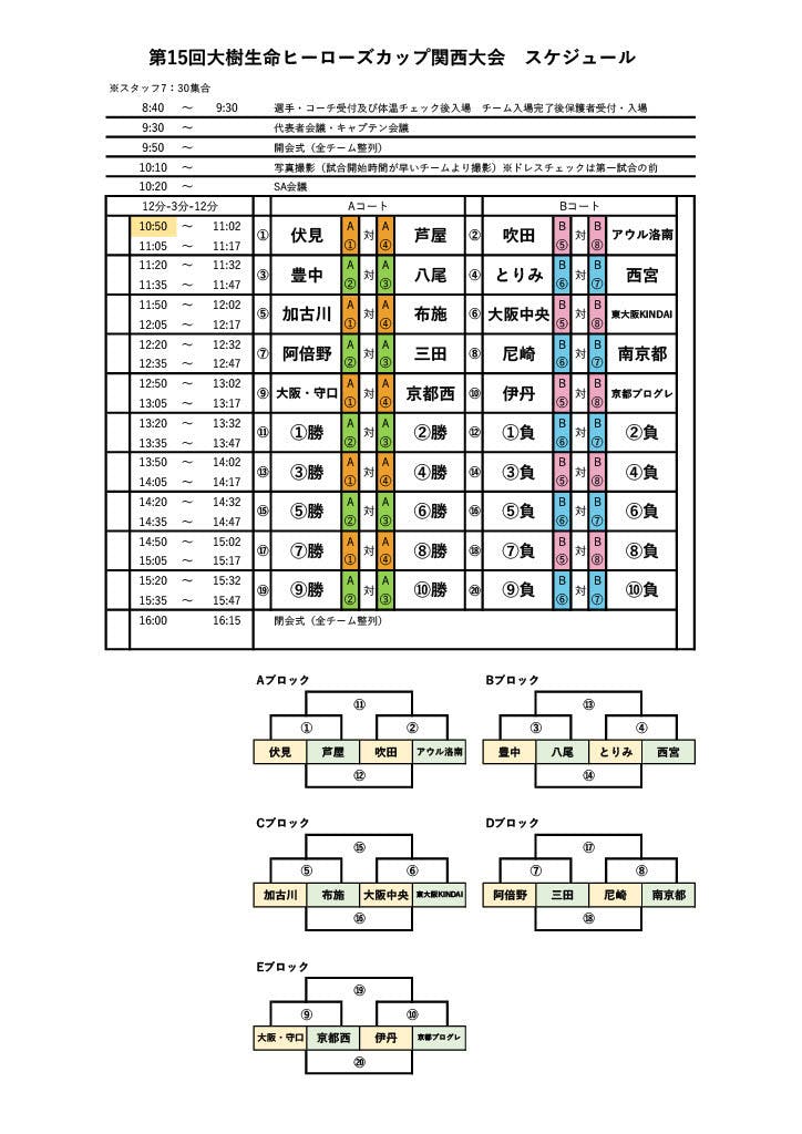 第15回大樹生命ヒーローズカップ関西大会の組み合わせです。