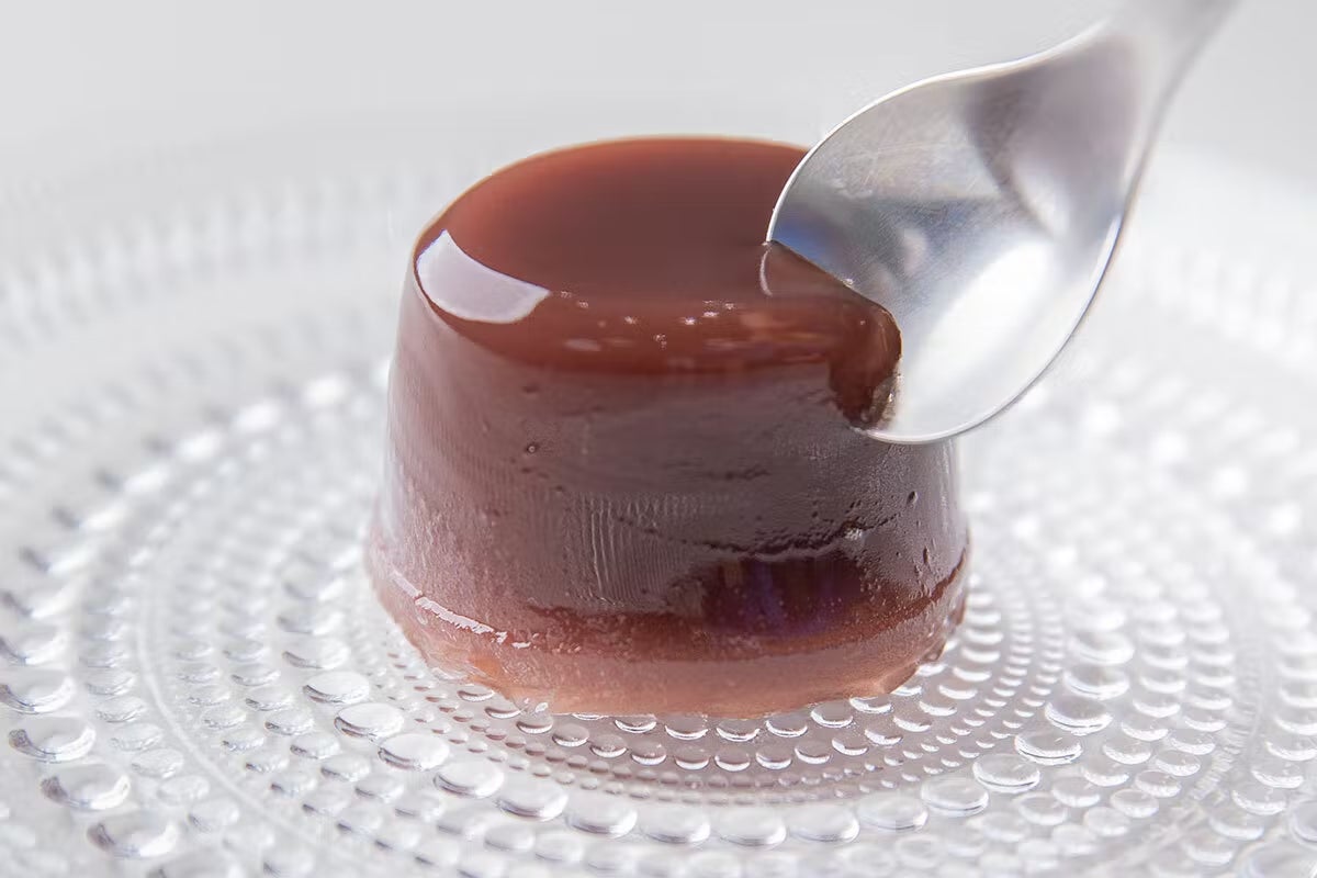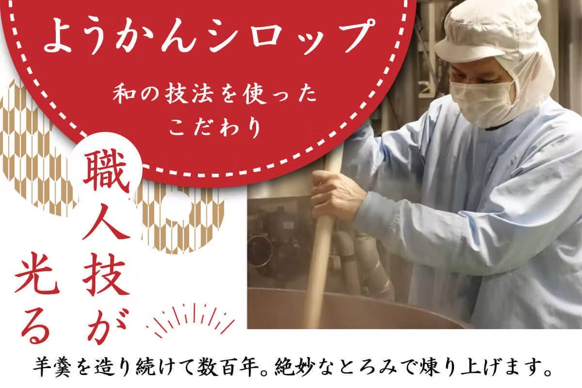 他社の水ようかんよりも煮詰める時間が長く、ようかんに近い食感が生まれます。出来上がりはほんのり透き通る透明感をキープしながら、水ようかんとようかんとの中間の硬さを実現しています。