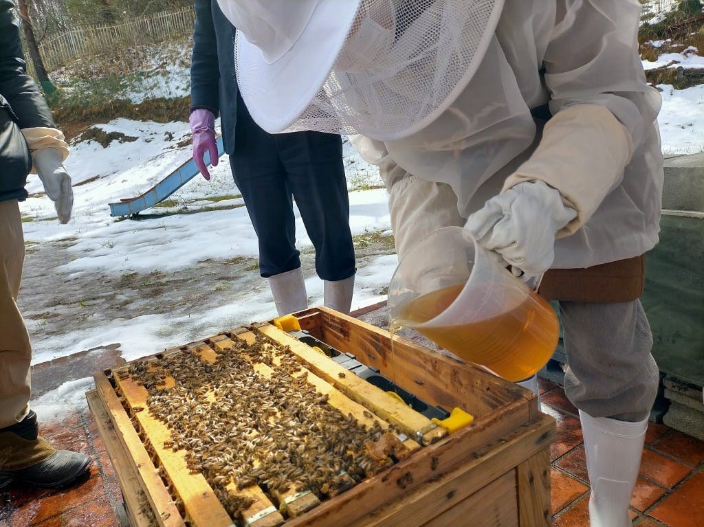 そして私たちが育てているのは、野生に近いため手が掛からない日本ミツバチではなく(趣味で養蜂をなさる方の多くはこちらです)、家畜化が進んだ西洋ミツバチです。西洋ミツバチは、うまく育てれば多くの蜜を集めてくれますが、人間が相当にお世話をしてあげねばなりません。冬眠から覚めたばかりの花が少ない季節は巣箱に餌として花粉を入れてあげたり、糖蜜(砂糖水)を補充してあげたり……といったサポートや、ミツバチの天敵であるスズメバチへの対策も必要です。