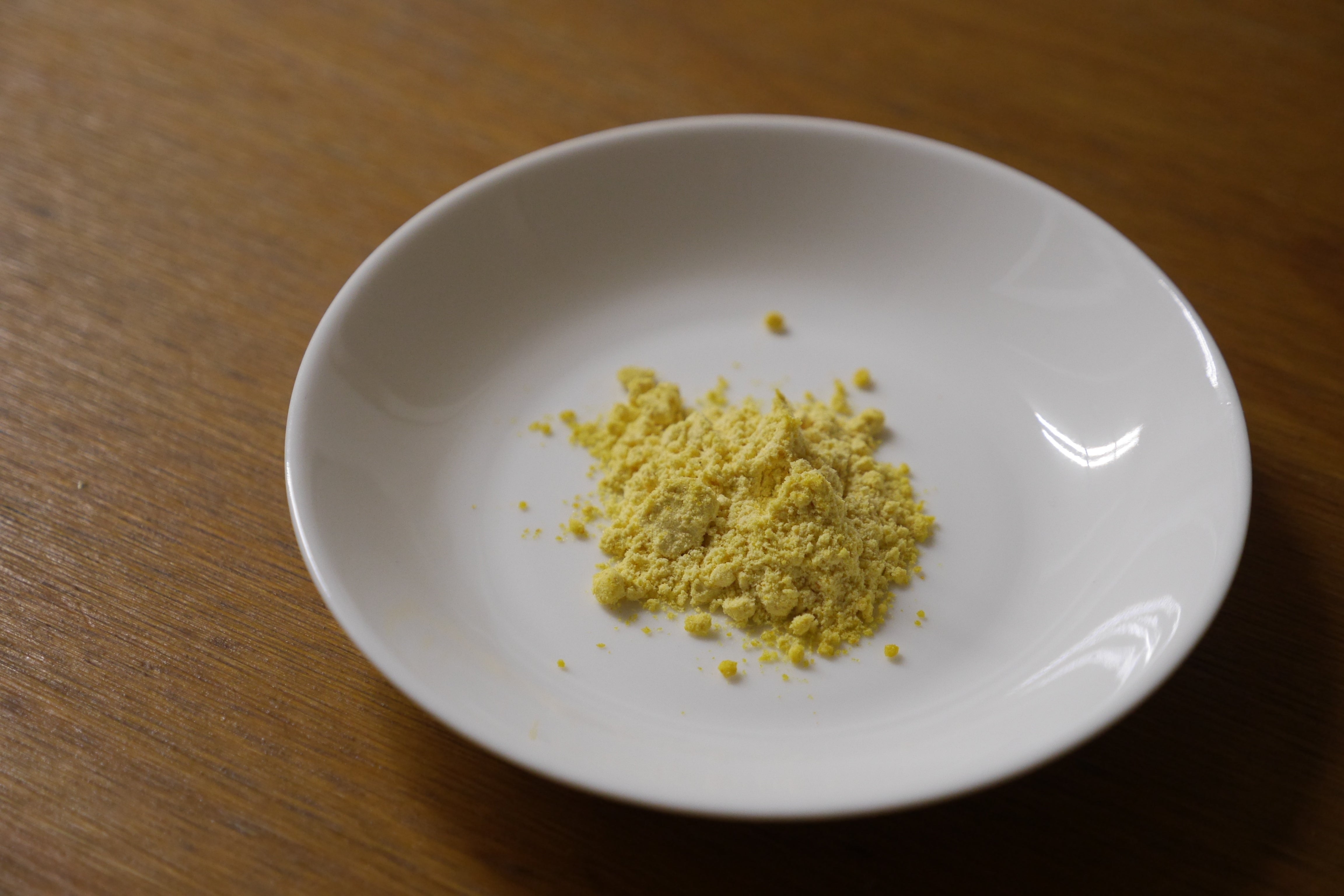 想像していたよりもずっと粉っぽく、水分を含むときれいなオレンジ色になりました。お菓子とかで色を付けるにはちょうどいいかもしれません。